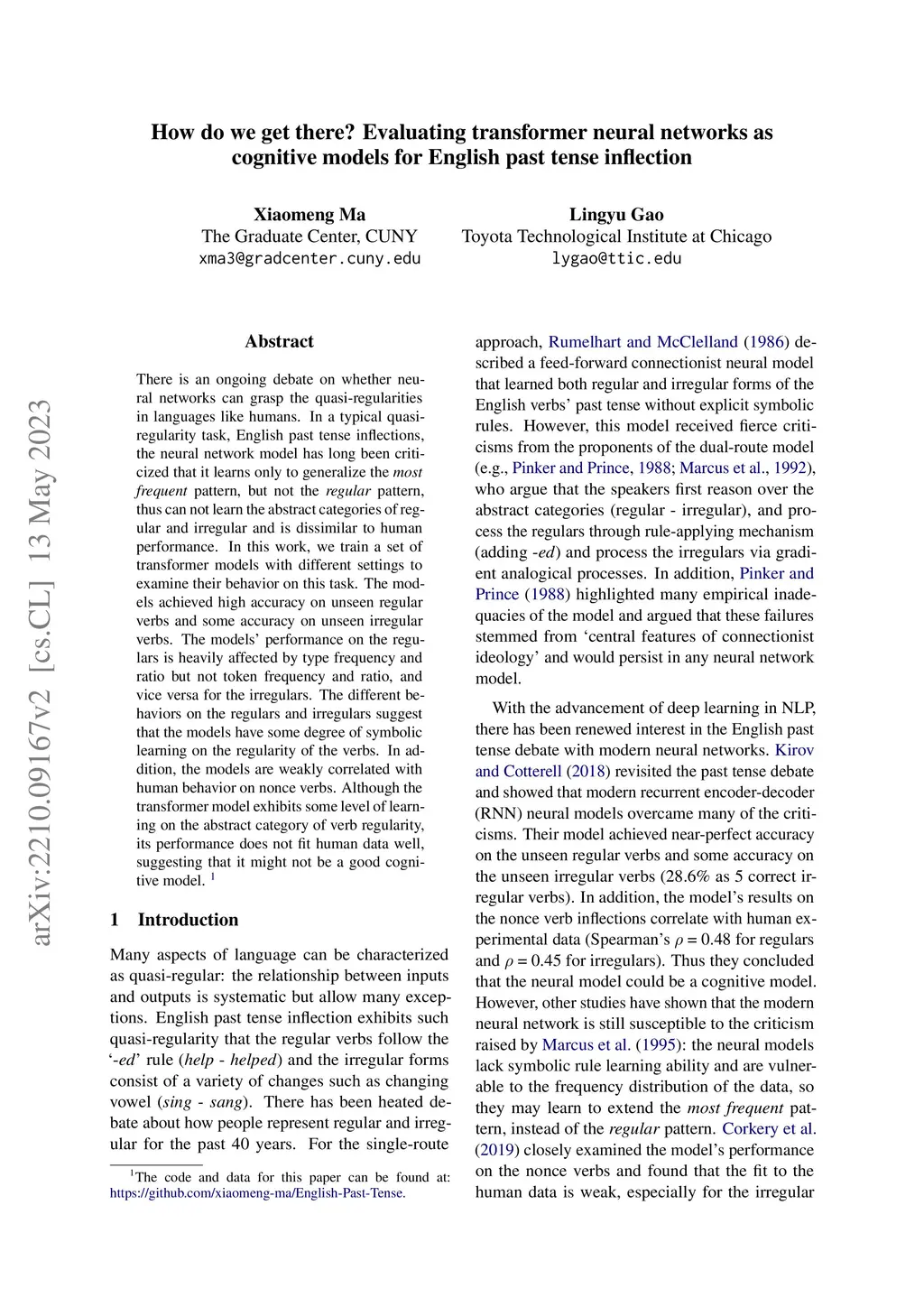 models for English past tense inflection