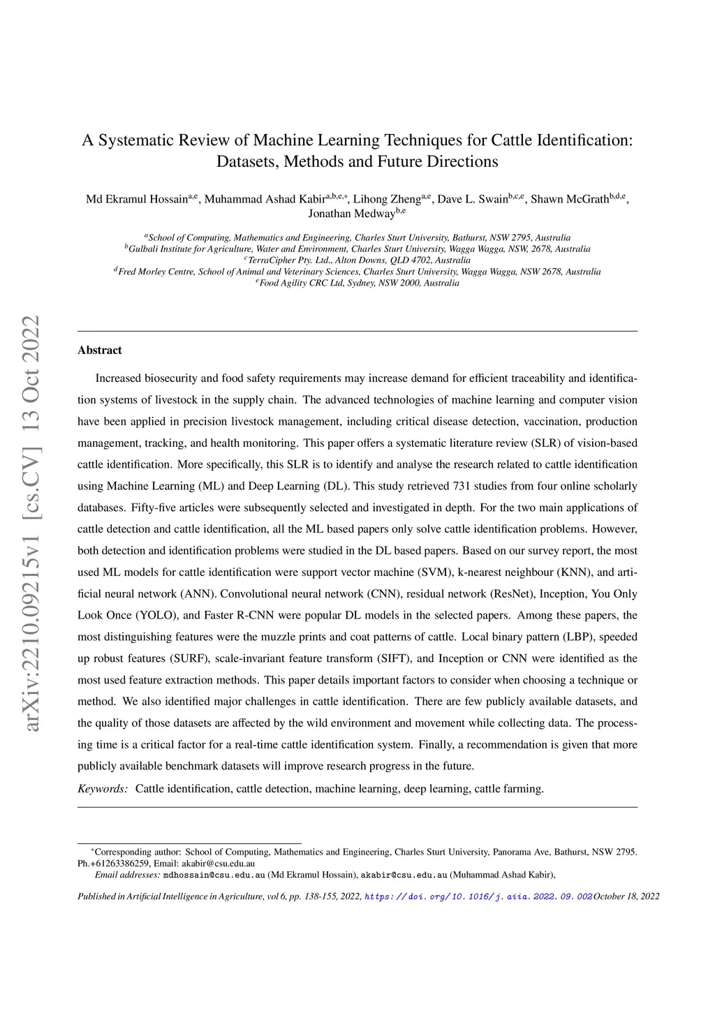 A Systematic Review of Machine Learning Techniques for Cattle