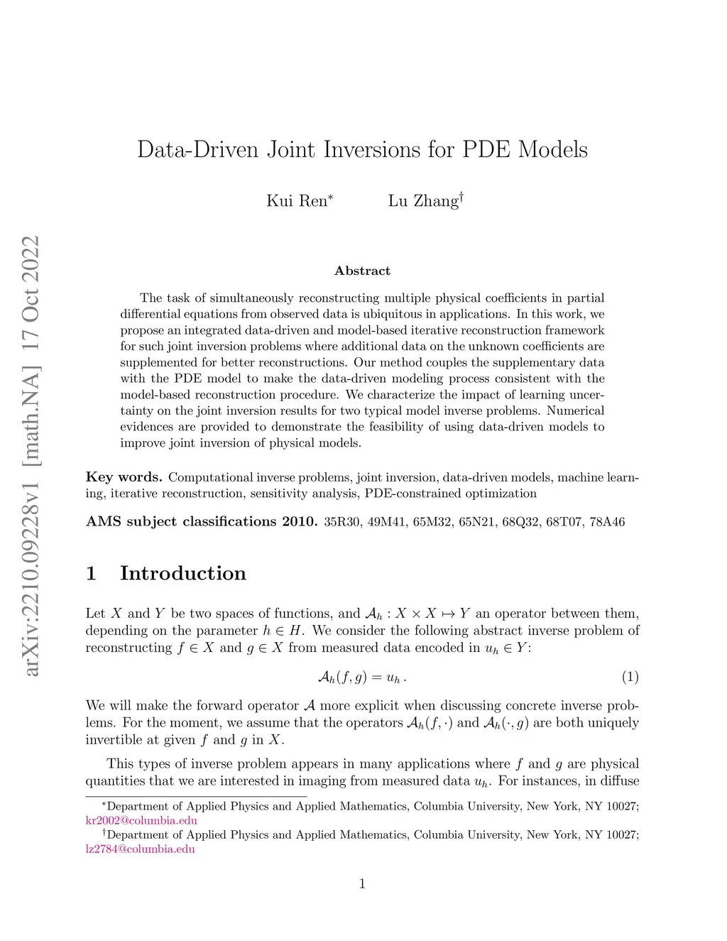 The task of simultaneously reconstructing multiple physical coefficients in partial differential equations (PDEs) from observed data is ubiquitous in applications. In this work, we propose an integrated data-driven and model-based iterative reconstruction framework for such joint inversion problems where additional data on the unknown coefficients are supplemented for better reconstructions. Our method couples the supplementary data with the PDE model to make the data-driven modeling process consistent with the model-based reconstruction procedure. We characterize the impact of learning uncertainty on the joint inversion results for two typical inverse problems. Numerical evidence is provided to demonstrate the feasibility of using data-driven models to improve the joint inversion of multiple coefficients in PDEs.