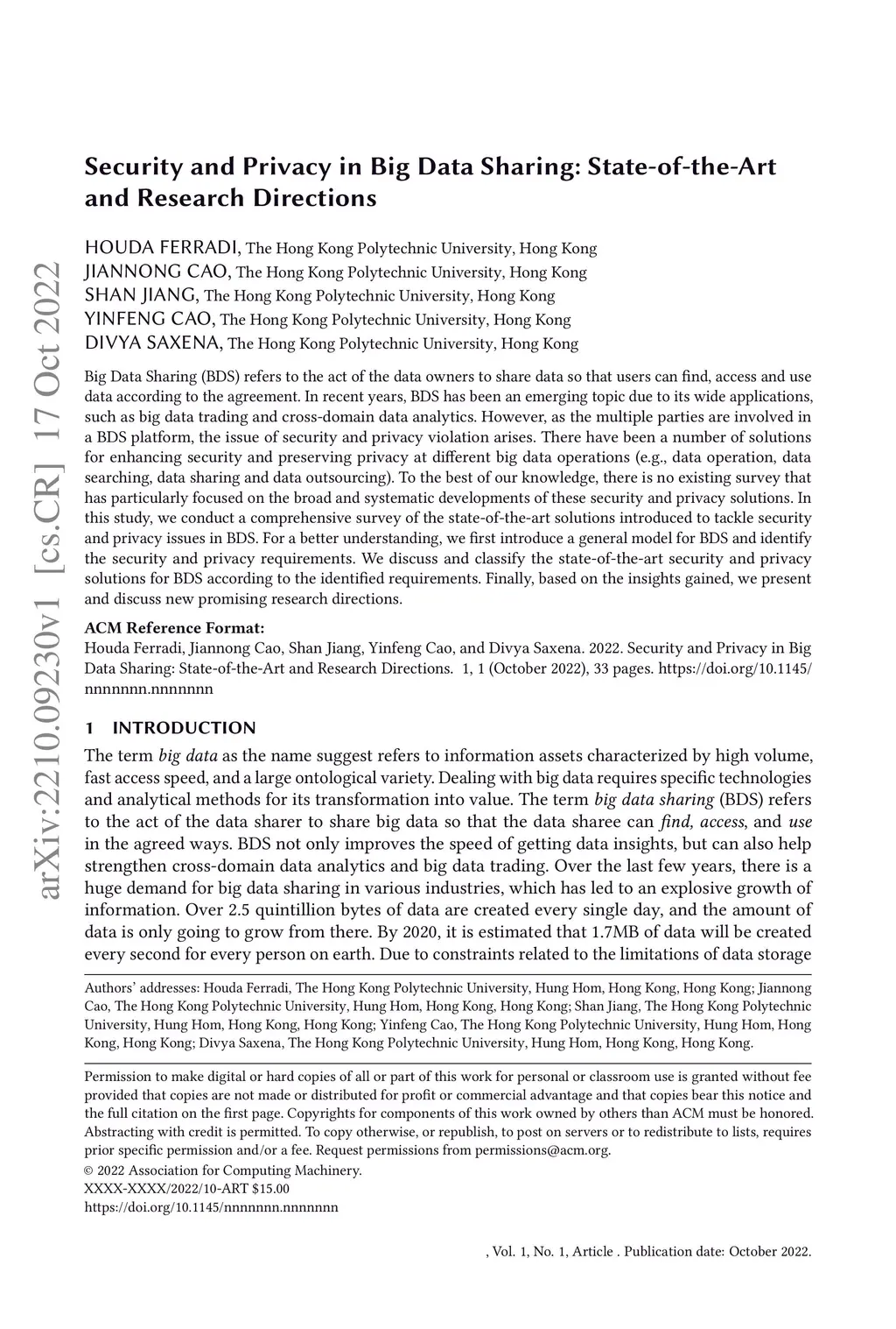 Security and Privacy in Big Data Sharing: State-of-the-Art and Research
