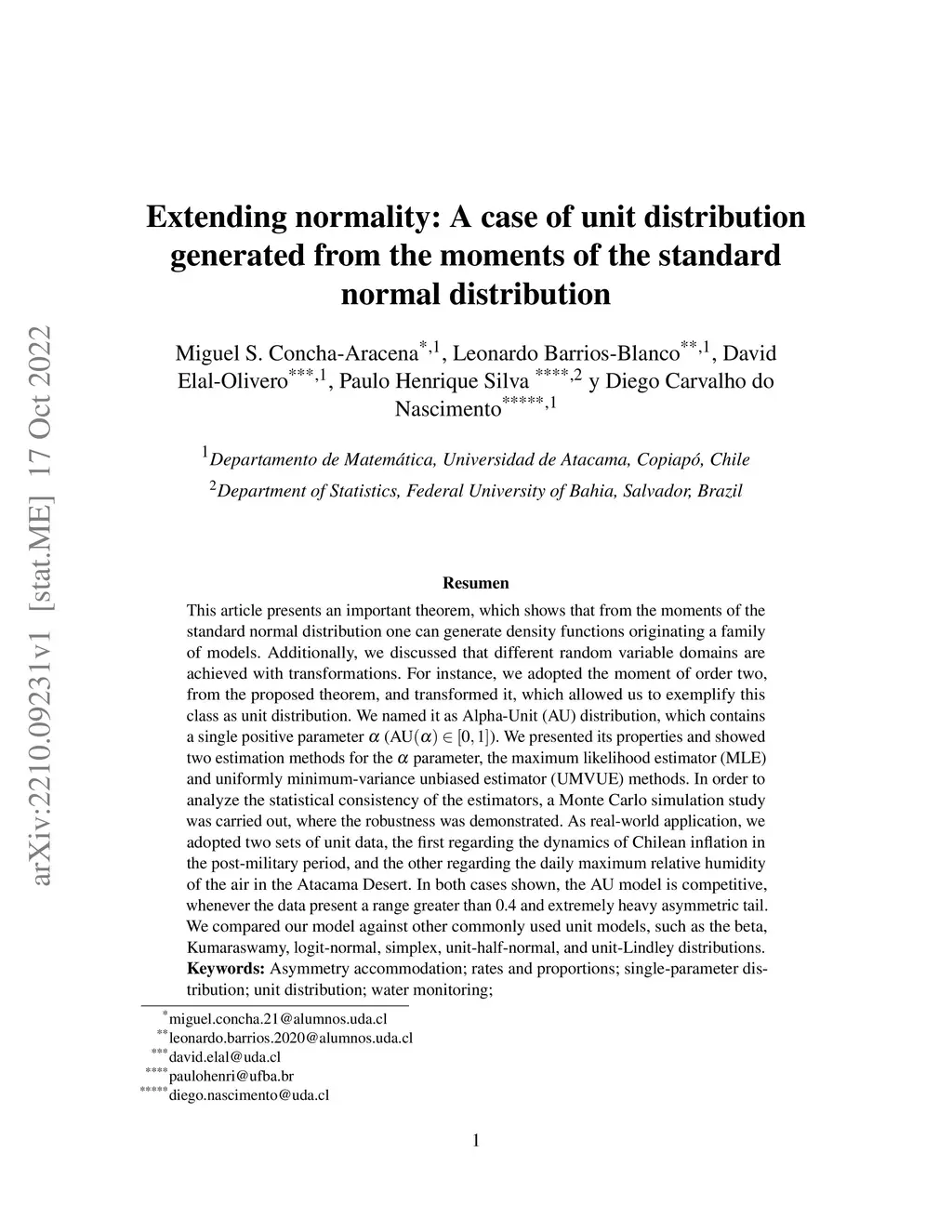 This article presents an important theorem, which shows that from the moments of the standard normal distribution one can generate density functions originating a family of models. Additionally, we discussed that different random variable domains are achieved with transformations. For instance, we adopted the moment of order two, from the proposed theorem, and transformed it, which allowed us to exemplify this class as unit distribution. We named it as Alpha-Unit (AU) distribution, which contains a single positive parameter (). We presented its properties and showed two estimation methods for the parameter, the maximum likelihood estimator (MLE) and uniformly minimum-variance unbiased estimator (UMVUE) methods. In order to analyze the statistical consistency of the estimators, a Monte Carlo simulation study was carried out, where the robustness was demonstrated. As real-world application, we adopted two sets of unit data, the first regarding the dynamics of Chilean inflation in the post-military period, and the other regarding the daily maximum relative humidity of the air in the Atacama Desert. In both cases shown, the AU model is competitive, whenever the data present a range greater than 0.4 and extremely heavy asymmetric tail. We compared our model against other commonly used unit models, such as the beta, Kumaraswamy, logit-normal, simplex, unit-half-normal, and unit-Lindley distributions.
