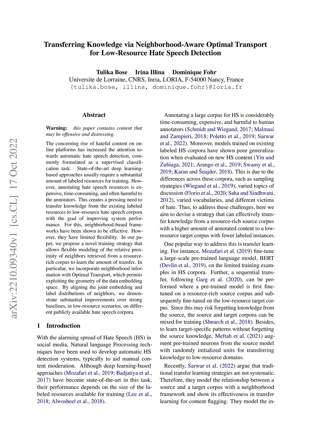 The concerning rise of hateful content on online platforms has increased the attention towards automatic hate speech detection, commonly formulated as a supervised classification task. State-of-the-art deep learning-based approaches usually require a substantial amount of labeled resources for training. However, annotating hate speech resources is expensive, time-consuming, and often harmful to the annotators. This creates a pressing need to transfer knowledge from the existing labeled resources to low-resource hate speech corpora with the goal of improving system performance. For this, neighborhood-based frameworks have been shown to be effective. However, they have limited flexibility. In our paper, we propose a novel training strategy that allows flexible modeling of the relative proximity of neighbors retrieved from a resource-rich corpus to learn the amount of transfer. In particular, we incorporate neighborhood information with Optimal Transport, which permits exploiting the geometry of the data embedding space. By aligning the joint embedding and label distributions of neighbors, we demonstrate substantial improvements over strong baselines, in low-resource scenarios, on different publicly available hate speech corpora.
