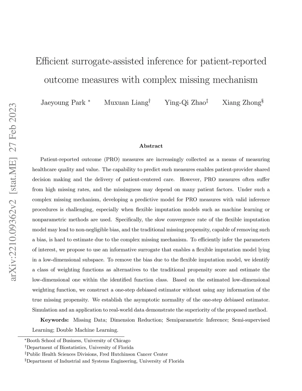 Patient-reported outcome (PRO) measures are increasingly collected as a means of measuring healthcare quality and value. The capability to predict such measures enables patient-provider shared decision making and the delivery of patient-centered care. However, due to their voluntary nature, PRO measures often suffer from a high missing rate, and the missingness may depend on many patient factors. Under such a complex missing mechanism, statistical inference of the parameters in prediction models for PRO measures is challenging, especially when flexible imputation models such as machine learning or nonparametric methods are used. Specifically, the slow convergence rate of the flexible imputation model may lead to non-negligible bias, and the traditional missing propensity, capable of removing such a bias, is hard to estimate due to the complex missing mechanism. To efficiently infer the parameters of interest, we propose to use an informative surrogate that can lead to a flexible imputation model lying in a low-dimensional subspace. To remove the bias due to the flexible imputation model, we identify a class of weighting functions as alternatives to the traditional propensity score and estimate the low-dimensional one within the identified function class. Based on the estimated low-dimensional weighting function, we construct a one-step debiased estimator without using any information of the true missing propensity. We establish the asymptotic normality of the one-step debiased estimator. Simulation and an application to real-world data demonstrate the superiority of the proposed method.
