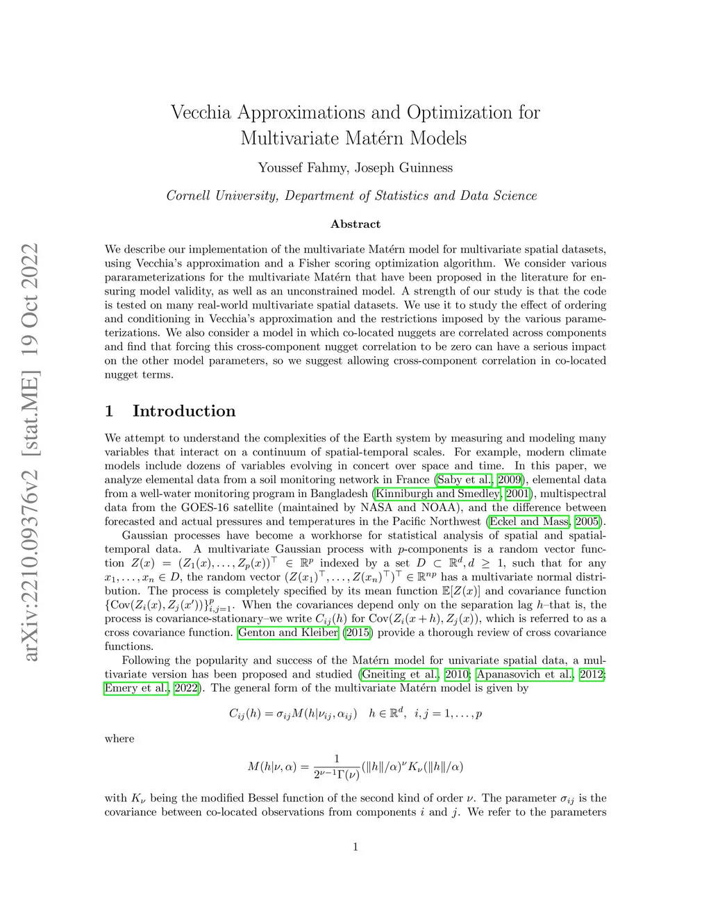 We describe our implementation of the multivariate Mat\érn model for multivariate spatial datasets, using Vecchia's approximation and a Fisher scoring optimization algorithm. We consider various pararameterizations for the multivariate Mat\érn that have been proposed in the literature for ensuring model validity, as well as an unconstrained model. A strength of our study is that the code is tested on many real-world multivariate spatial datasets. We use it to study the effect of ordering and conditioning in Vecchia's approximation and the restrictions imposed by the various parameterizations. We also consider a model in which co-located nuggets are correlated across components and find that forcing this cross-component nugget correlation to be zero can have a serious impact on the other model parameters, so we suggest allowing cross-component correlation in co-located nugget terms.