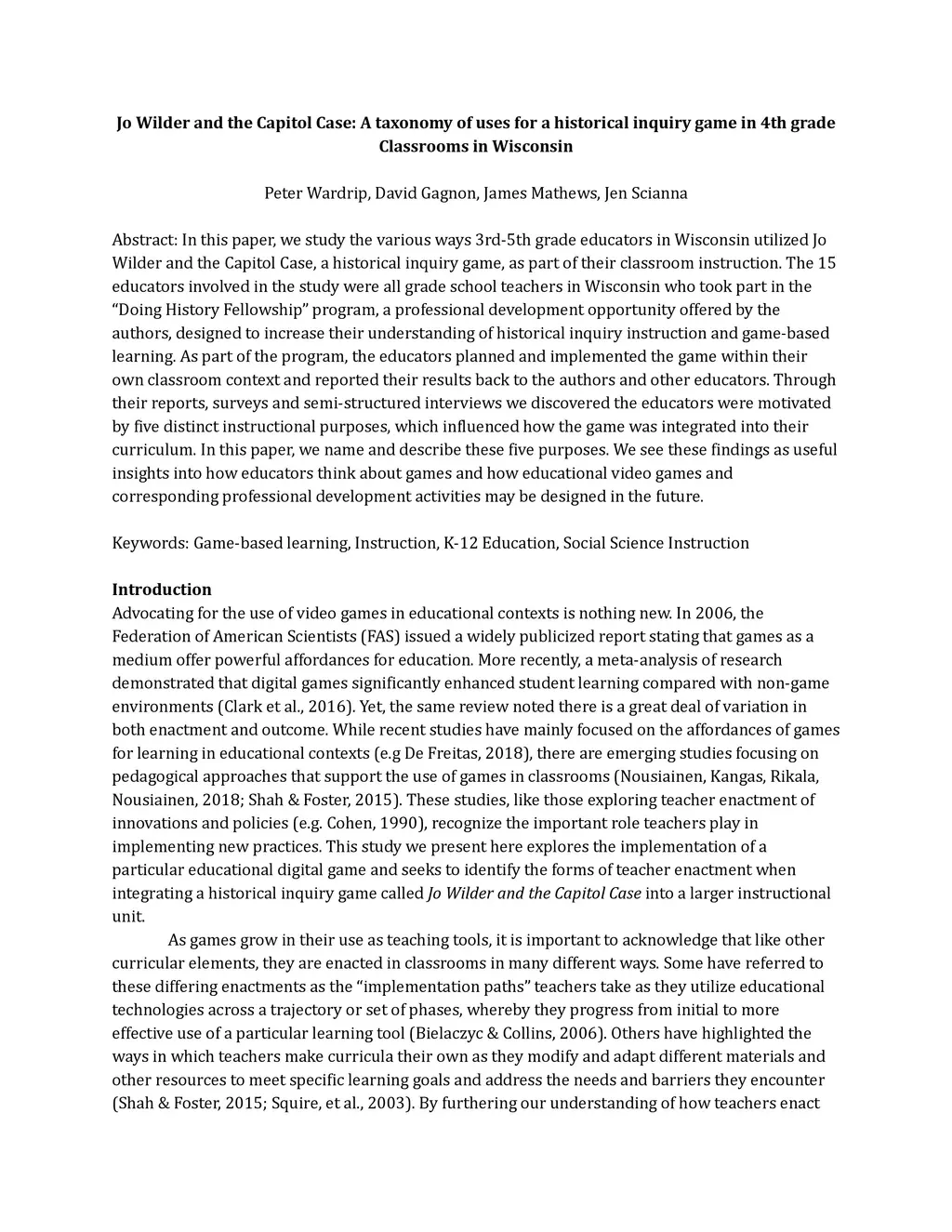 In this paper, we study the various ways 3rd-5th grade educators in Wisconsin utilized Jo Wilder and the Capitol Case, a historical inquiry game, as part of their classroom instruction. The 15 educators involved in the study were all grade school teachers in Wisconsin who took part in the "Doing History Fellowship" program, a professional development opportunity offered by the authors, designed to increase their understanding of historical inquiry instruction and game-based learning. As part of the program, the educators planned and implemented the game within their own classroom context and reported their results back to the authors and other educators. Through their reports, surveys and semi-structured interviews we discovered the educators were motivated by five distinct instructional purposes, which influenced how the game was integrated into their curriculum. In this paper, we name and describe these five purposes. We see these findings as useful insights into how educators think about games and how educational video games and corresponding professional development activities may be designed in the future.