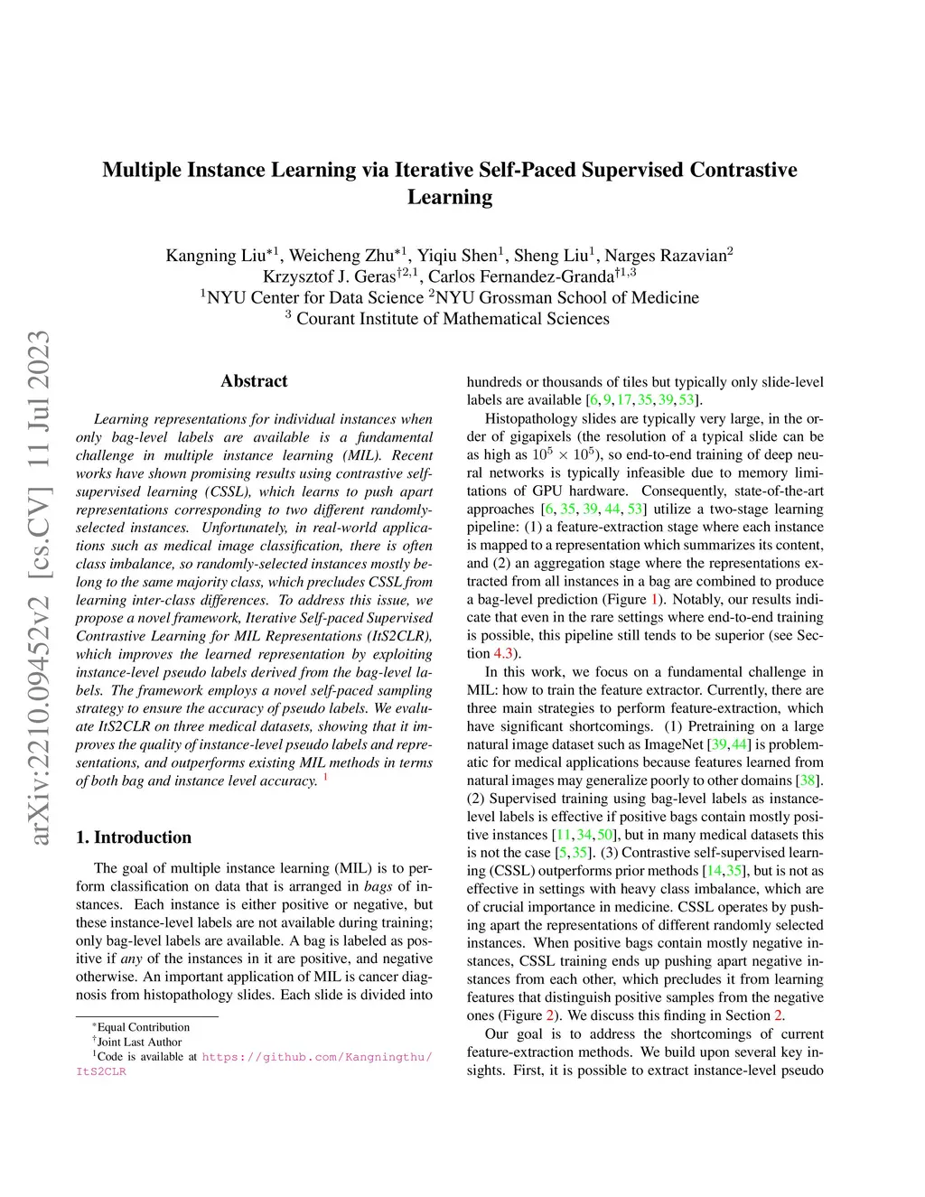 Learning representations for individual instances when only bag-level labels are available is a fundamental challenge in multiple instance learning (MIL). Recent works have shown promising results using contrastive self-supervised learning (CSSL), which learns to push apart representations corresponding to two different randomly-selected instances. Unfortunately, in real-world applications such as medical image classification, there is often class imbalance, so randomly-selected instances mostly belong to the same majority class, which precludes CSSL from learning inter-class differences. To address this issue, we propose a novel framework, Iterative Self-paced Supervised Contrastive Learning for MIL Representations (ItS2CLR), which improves the learned representation by exploiting instance-level pseudo labels derived from the bag-level labels. The framework employs a novel self-paced sampling strategy to ensure the accuracy of pseudo labels. We evaluate ItS2CLR on three medical datasets, showing that it improves the quality of instance-level pseudo labels and representations, and outperforms existing MIL methods in terms of both bag and instance level accuracy. Code is available at https://github.com/Kangningthu/ItS2CLR