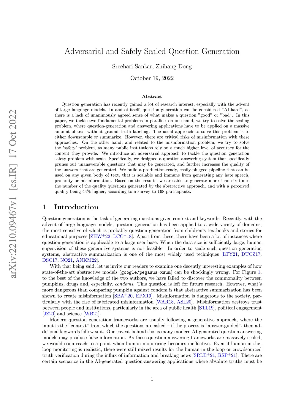 Question generation has recently gained a lot of research interest, especially with the advent of large language models. In and of itself, question generation can be considered ÁI-hard', as there is a lack of unanimously agreed sense of what makes a question 'good' or 'bad'. In this paper, we tackle two fundamental problems in parallel: on one hand, we try to solve the scaling problem, where question-generation and answering applications have to be applied to a massive amount of text without ground truth labeling. The usual approach to solve this problem is to either downsample or summarize. However, there are critical risks of misinformation with these approaches. On the other hand, and related to the misinformation problem, we try to solve the 'safety' problem, as many public institutions rely on a much higher level of accuracy for the content they provide. We introduce an adversarial approach to tackle the question generation safety problem with scale. Specifically, we designed a question-answering system that specifically prunes out unanswerable questions that may be generated, and further increases the quality of the answers that are generated. We build a production-ready, easily-plugged pipeline that can be used on any given body of text, that is scalable and immune from generating any hate speech, profanity, or misinformation. Based on the results, we are able to generate more than six times the number of quality questions generated by the abstractive approach, with a perceived quality being 44% higher, according to a survey of 168 participants.