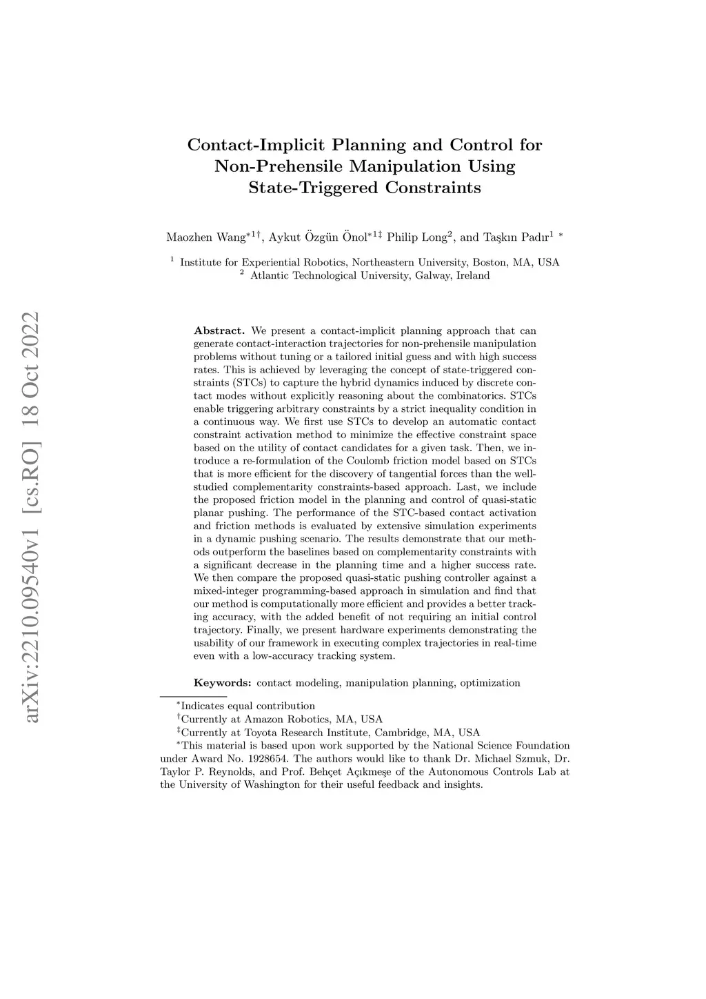 We present a contact-implicit planning approach that can generate contact-interaction trajectories for non-prehensile manipulation problems without tuning or a tailored initial guess and with high success rates. This is achieved by leveraging the concept of state-triggered constraints (STCs) to capture the hybrid dynamics induced by discrete contact modes without explicitly reasoning about the combinatorics. STCs enable triggering arbitrary constraints by a strict inequality condition in a continuous way. We first use STCs to develop an automatic contact constraint activation method to minimize the effective constraint space based on the utility of contact candidates for a given task. Then, we introduce a re-formulation of the Coulomb friction model based on STCs that is more efficient for the discovery of tangential forces than the well-studied complementarity constraints-based approach. Last, we include the proposed friction model in the planning and control of quasi-static planar pushing. The performance of the STC-based contact activation and friction methods is evaluated by extensive simulation experiments in a dynamic pushing scenario. The results demonstrate that our methods outperform the baselines based on complementarity constraints with a significant decrease in the planning time and a higher success rate. We then compare the proposed quasi-static pushing controller against a mixed-integer programming-based approach in simulation and find that our method is computationally more efficient and provides a better tracking accuracy, with the added benefit of not requiring an initial control trajectory. Finally, we present hardware experiments demonstrating the usability of our framework in executing complex trajectories in real-time even with a low-accuracy tracking system.
