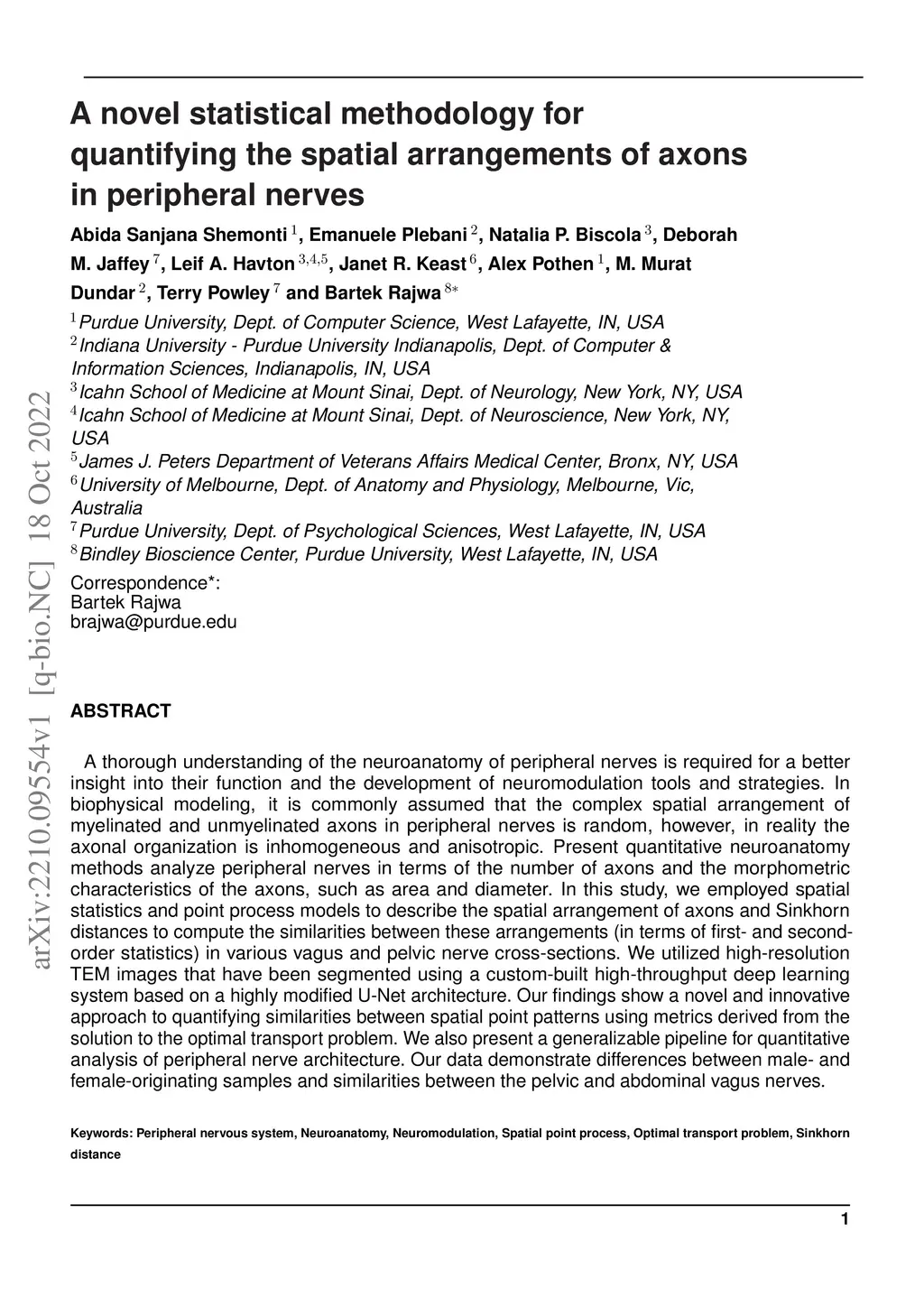 A thorough understanding of the neuroanatomy of peripheral nerves is required for a better insight into their function and the development of neuromodulation tools and strategies. In biophysical modeling, it is commonly assumed that the complex spatial arrangement of myelinated and unmyelinated axons in peripheral nerves is random, however, in reality the axonal organization is inhomogeneous and anisotropic. Present quantitative neuroanatomy methods analyze peripheral nerves in terms of the number of axons and the morphometric characteristics of the axons, such as area and diameter. In this study, we employed spatial statistics and point process models to describe the spatial arrangement of axons and Sinkhorn distances to compute the similarities between these arrangements (in terms of first- and second-order statistics) in various vagus and pelvic nerve cross-sections. We utilized high-resolution TEM images that have been segmented using a custom-built high-throughput deep learning system based on a highly modified U-Net architecture. Our findings show a novel and innovative approach to quantifying similarities between spatial point patterns using metrics derived from the solution to the optimal transport problem. We also present a generalizable pipeline for quantitative analysis of peripheral nerve architecture. Our data demonstrate differences between male- and female-originating samples and similarities between the pelvic and abdominal vagus nerves.
