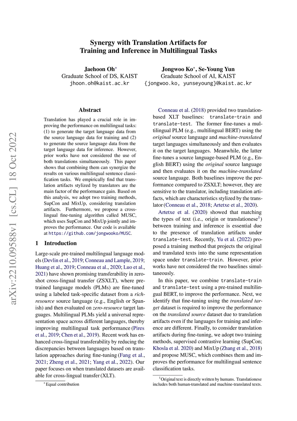 Translation has played a crucial role in improving the performance on multilingual tasks: (1) to generate the target language data from the source language data for training and (2) to generate the source language data from the target language data for inference. However, prior works have not considered the use of both translations simultaneously. This paper shows that combining them can synergize the results on various multilingual sentence classification tasks. We empirically find that translation artifacts stylized by translators are the main factor of the performance gain. Based on this analysis, we adopt two training methods, SupCon and MixUp, considering translation artifacts. Furthermore, we propose a cross-lingual fine-tuning algorithm called MUSC, which uses SupCon and MixUp jointly and improves the performance. Our code is available at https://github.com/jongwooko/MUSC.