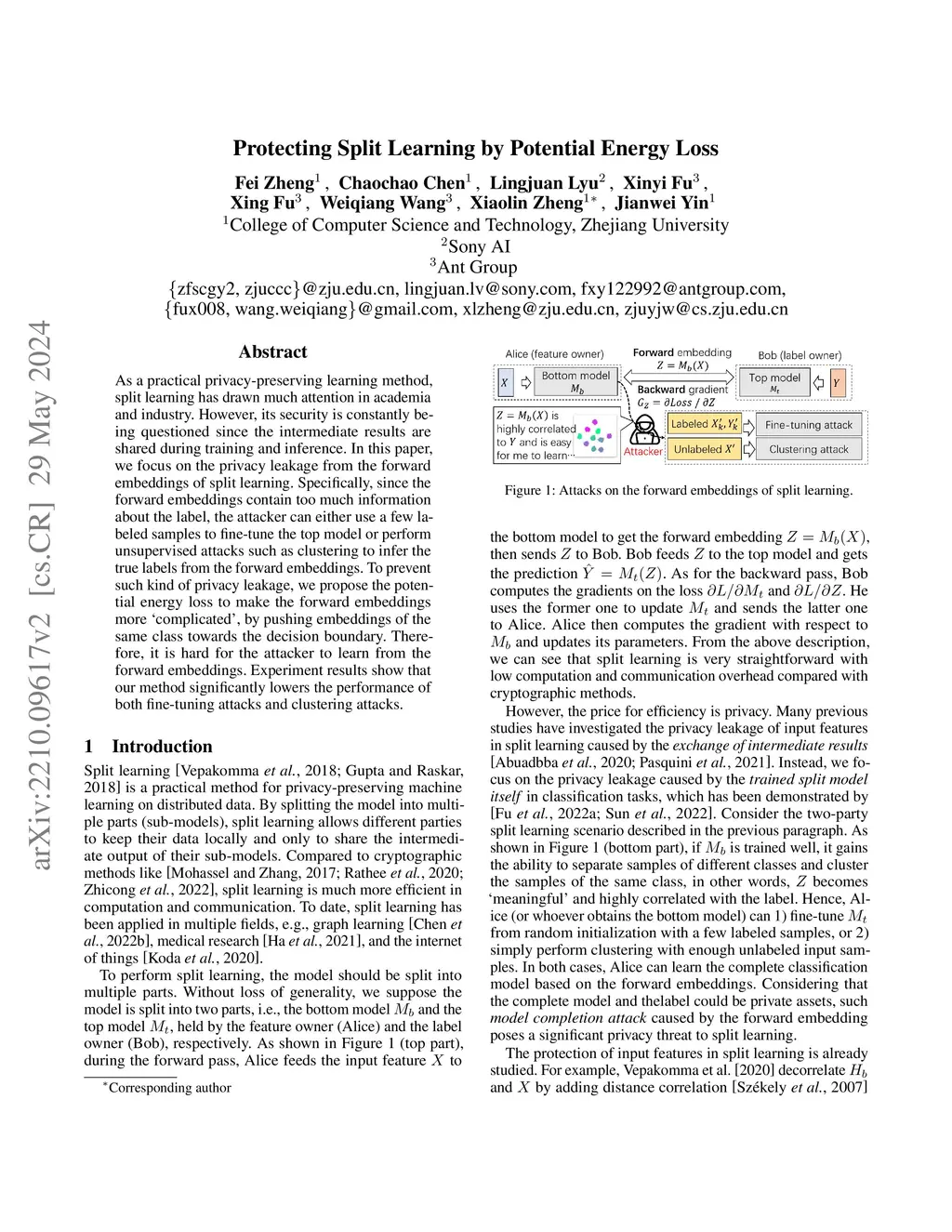 As a practical privacy-preserving learning method, split learning has drawn much attention in academia and industry. However, its security is constantly being questioned since the intermediate results are shared during training and inference. In this paper, we focus on the privacy leakage from the forward embeddings of split learning. Specifically, since the forward embeddings contain too much information about the label, the attacker can either use a few labeled samples to fine-tune the top model or perform unsupervised attacks such as clustering to infer the true labels from the forward embeddings. To prevent such kind of privacy leakage, we propose the potential energy loss to make the forward embeddings become more 'complicated', by pushing embeddings of the same class towards the decision boundary. Therefore, it is hard for the attacker to learn from the forward embeddings. Experiment results show that our method significantly lowers the performance of both fine-tuning attacks and clustering attacks.