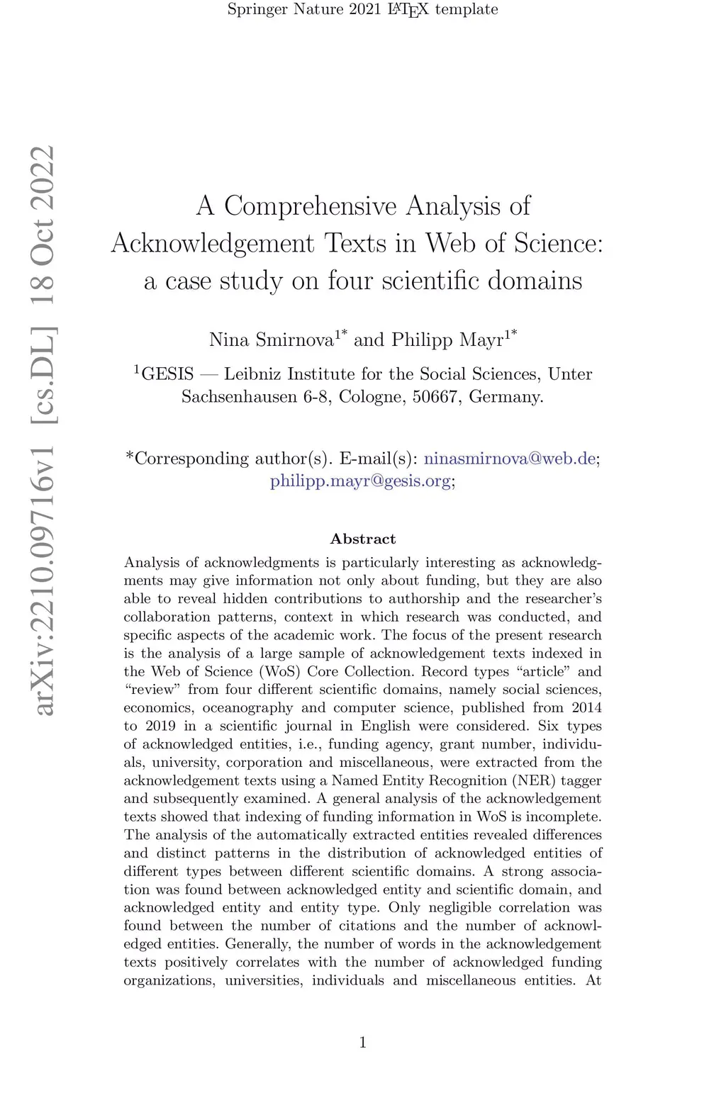 Analysis of acknowledgments is particularly interesting as acknowledgments may give information not only about funding, but they are also able to reveal hidden contributions to authorship and the researcher's collaboration patterns, context in which research was conducted, and specific aspects of the academic work. The focus of the present research is the analysis of a large sample of acknowledgement texts indexed in the Web of Science (WoS) Core Collection. Record types árticle' and 'review' from four different scientific domains, namely social sciences, economics, oceanography and computer science, published from 2014 to 2019 in a scientific journal in English were considered. Six types of acknowledged entities, i.e., funding agency, grant number, individuals, university, corporation and miscellaneous, were extracted from the acknowledgement texts using a Named Entity Recognition (NER) tagger and subsequently examined. A general analysis of the acknowledgement texts showed that indexing of funding information in WoS is incomplete. The analysis of the automatically extracted entities revealed differences and distinct patterns in the distribution of acknowledged entities of different types between different scientific domains. A strong association was found between acknowledged entity and scientific domain and acknowledged entity and entity type. Only negligible correlation was found between the number of citations and the number of acknowledged entities. Generally, the number of words in the acknowledgement texts positively correlates with the number of acknowledged funding organizations, universities, individuals and miscellaneous entities. At the same time, acknowledgement texts with the larger number of sentences have more acknowledged individuals and miscellaneous categories.