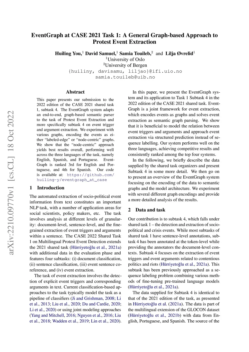 This paper presents our submission to the 2022 edition of the CASE 2021 shared task 1, subtask 4. The EventGraph system adapts an end-to-end, graph-based semantic parser to the task of Protest Event Extraction and more specifically subtask 4 on event trigger and argument extraction. We experiment with various graphs, encoding the events as either "labeled-edge" or "node-centric" graphs. We show that the "node-centric" approach yields best results overall, performing well across the three languages of the task, namely English, Spanish, and Portuguese. EventGraph is ranked 3rd for English and Portuguese, and 4th for Spanish. Our code is available at: https://github.com/huiling-y/eventgraph_at_case