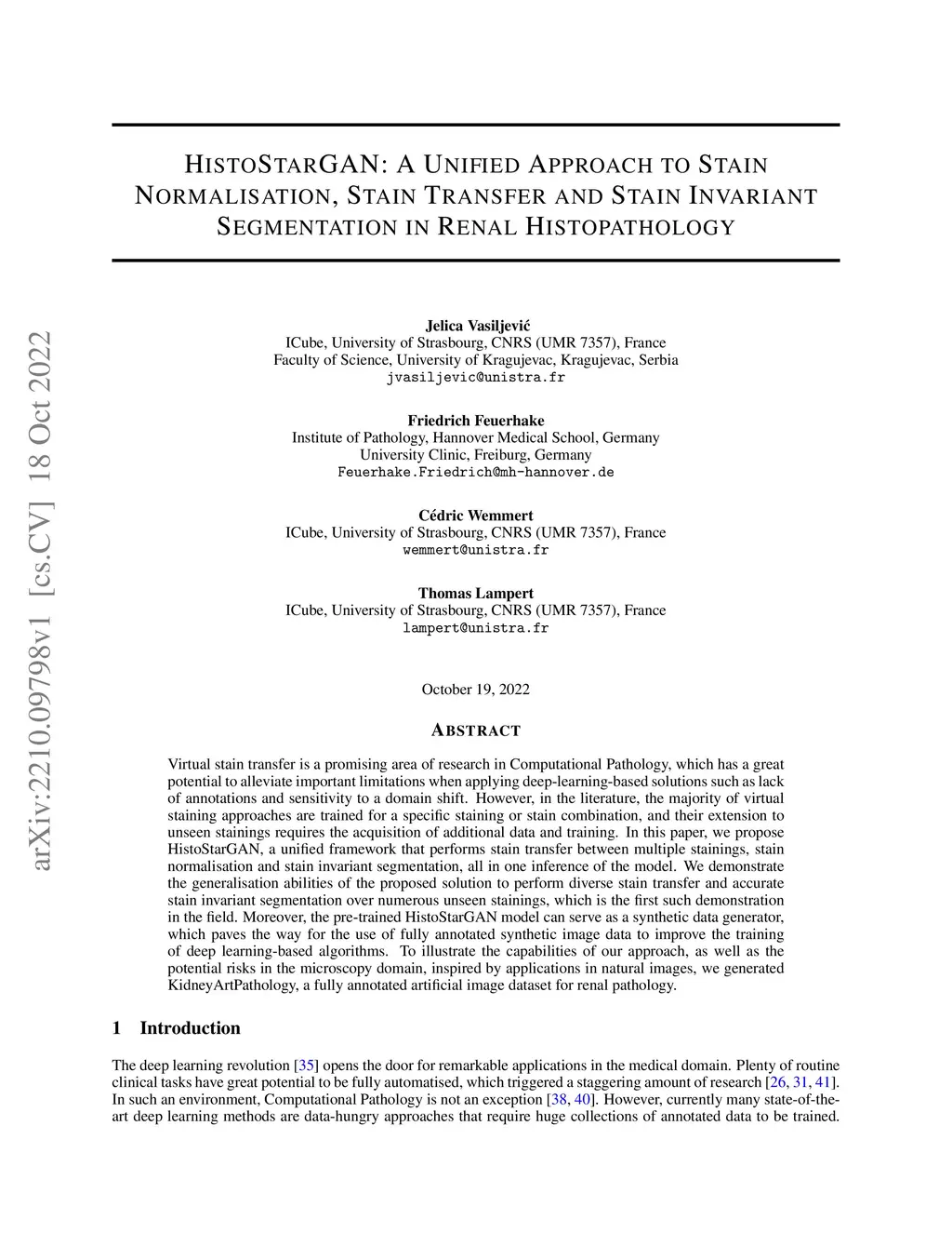 Virtual stain transfer is a promising area of research in Computational Pathology, which has a great potential to alleviate important limitations when applying deeplearningbased solutions such as lack of annotations and sensitivity to a domain shift. However, in the literature, the majority of virtual staining approaches are trained for a specific staining or stain combination, and their extension to unseen stainings requires the acquisition of additional data and training. In this paper, we propose HistoStarGAN, a unified framework that performs stain transfer between multiple stainings, stain normalisation and stain invariant segmentation, all in one inference of the model. We demonstrate the generalisation abilities of the proposed solution to perform diverse stain transfer and accurate stain invariant segmentation over numerous unseen stainings, which is the first such demonstration in the field. Moreover, the pre-trained HistoStar-GAN model can serve as a synthetic data generator, which paves the way for the use of fully annotated synthetic image data to improve the training of deep learning-based algorithms. To illustrate the capabilities of our approach, as well as the potential risks in the microscopy domain, inspired by applications in natural images, we generated KidneyArtPathology, a fully annotated artificial image dataset for renal pathology.