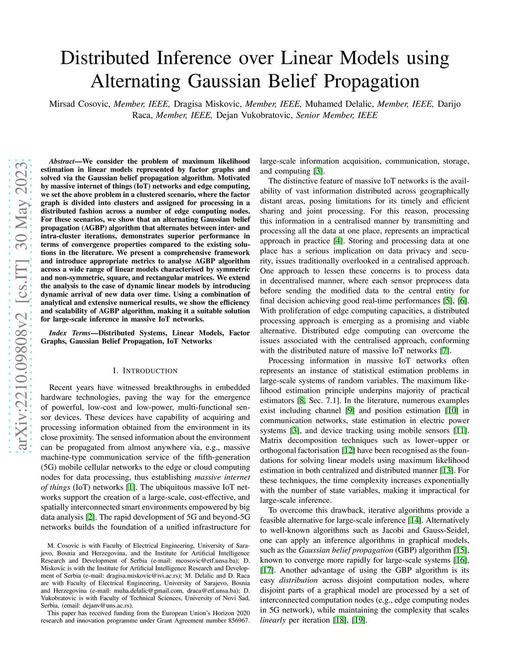 We consider the problem of maximum likelihood estimation in linear models represented by factor graphs and solved via the Gaussian belief propagation algorithm. Motivated by massive internet of things (IoT) networks and edge computing, we set the above problem in a clustered scenario, where the factor graph is divided into clusters and assigned for processing in a distributed fashion across a number of edge computing nodes. For these scenarios, we show that an alternating Gaussian belief propagation (AGBP) algorithm that alternates between inter- and intra-cluster iterations, demonstrates superior performance in terms of convergence properties compared to the existing solutions in the literature. We present a comprehensive framework and introduce appropriate metrics to analyse AGBP algorithm across a wide range of linear models characterised by symmetric and non-symmetric, square, and rectangular matrices. We extend the analysis to the case of dynamic linear models by introducing dynamic arrival of new data over time. Using a combination of analytical and extensive numerical results, we show the efficiency and scalability of AGBP algorithm, making it a suitable solution for large-scale inference in massive IoT networks.