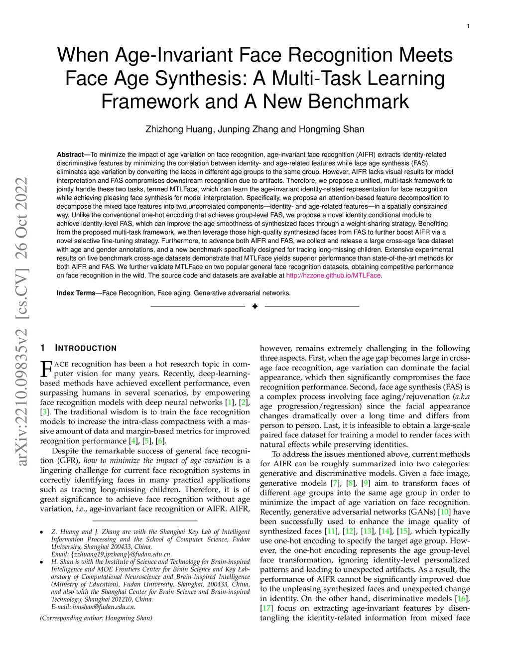 To minimize the impact of age variation on face recognition, age-invariant face recognition (AIFR) extracts identity-related discriminative features by minimizing the correlation between identity- and age-related features while face age synthesis (FAS) eliminates age variation by converting the faces in different age groups to the same group. However, AIFR lacks visual results for model interpretation and FAS compromises downstream recognition due to artifacts. Therefore, we propose a unified, multi-task framework to jointly handle these two tasks, termed MTLFace, which can learn the age-invariant identity-related representation for face recognition while achieving pleasing face synthesis for model interpretation. Specifically, we propose an attention-based feature decomposition to decompose the mixed face features into two uncorrelated components -- identity- and age-related features -- in a spatially constrained way. Unlike the conventional one-hot encoding that achieves group-level FAS, we propose a novel identity conditional module to achieve identity-level FAS, which can improve the age smoothness of synthesized faces through a weight-sharing strategy. Benefiting from the proposed multi-task framework, we then leverage those high-quality synthesized faces from FAS to further boost AIFR via a novel selective fine-tuning strategy. Furthermore, to advance both AIFR and FAS, we collect and release a large cross-age face dataset with age and gender annotations, and a new benchmark specifically designed for tracing long-missing children. Extensive experimental results on five benchmark cross-age datasets demonstrate that MTLFace yields superior performance for both AIFR and FAS. We further validate MTLFace on two popular general face recognition datasets, obtaining competitive performance on face recognition in the wild. Code is available at http://hzzone.github.io/MTLFace.