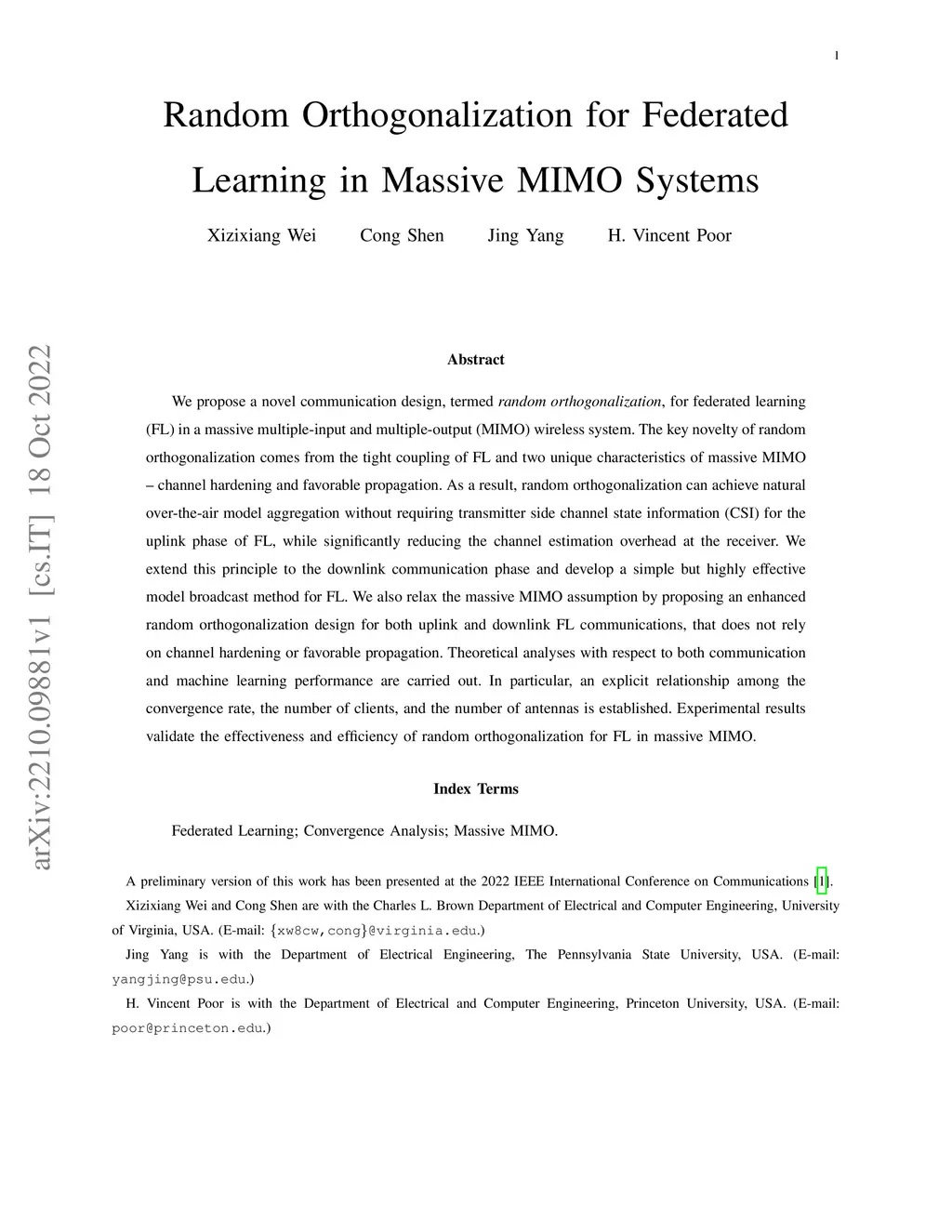 We propose a novel communication design, termed random orthogonalization, for federated learning (FL) in a massive multiple-input and multiple-output (MIMO) wireless system. The key novelty of random orthogonalization comes from the tight coupling of FL and two unique characteristics of massive MIMO -- channel hardening and favorable propagation. As a result, random orthogonalization can achieve natural over-the-air model aggregation without requiring transmitter side channel state information (CSI) for the uplink phase of FL, while significantly reducing the channel estimation overhead at the receiver. We extend this principle to the downlink communication phase and develop a simple but highly effective model broadcast method for FL. We also relax the massive MIMO assumption by proposing an enhanced random orthogonalization design for both uplink and downlink FL communications, that does not rely on channel hardening or favorable propagation. Theoretical analyses with respect to both communication and machine learning performance are carried out. In particular, an explicit relationship among the convergence rate, the number of clients, and the number of antennas is established. Experimental results validate the effectiveness and efficiency of random orthogonalization for FL in massive MIMO.