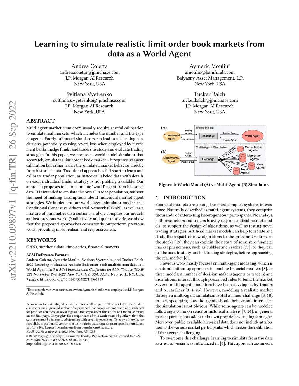 Multi-agent market simulators usually require careful calibration to emulate real markets, which includes the number and the type of agents. Poorly calibrated simulators can lead to misleading conclusions, potentially causing severe loss when employed by investment banks, hedge funds, and traders to study and evaluate trading strategies. In this paper, we propose a world model simulator that accurately emulates a limit order book market -- it requires no agent calibration but rather learns the simulated market behavior directly from historical data. Traditional approaches fail short to learn and calibrate trader population, as historical labeled data with details on each individual trader strategy is not publicly available. Our approach proposes to learn a unique "world" agent from historical data. It is intended to emulate the overall trader population, without the need of making assumptions about individual market agent strategies. We implement our world agent simulator models as a Conditional Generative Adversarial Network (CGAN), as well as a mixture of parametric distributions, and we compare our models against previous work. Qualitatively and quantitatively, we show that the proposed approaches consistently outperform previous work, providing more realism and responsiveness.