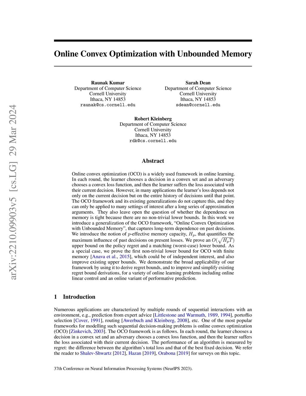 Online convex optimization (OCO) is a widely used framework in online learning. In each round, the learner chooses a decision in a convex set and an adversary chooses a convex loss function, and then the learner suffers the loss associated with their current decision. However, in many applications the learner's loss depends not only on the current decision but on the entire history of decisions until that point. The OCO framework and its existing generalizations do not capture this, and they can only be applied to many settings of interest after a long series of approximation arguments. They also leave open the question of whether the dependence on memory is tight because there are no non-trivial lower bounds. In this work we introduce a generalization of the OCO framework, "Online Convex Optimization with Unbounded Memory", that captures long-term dependence on past decisions. We introduce the notion of -effective memory capacity, , that quantifies the maximum influence of past decisions on present losses. We prove an upper bound on the policy regret and a matching (worst-case) lower bound. As a special case, we prove the first non-trivial lower bound for OCO with finite memory \citep{anavaHM2015online}, which could be of independent interest, and also improve existing upper bounds. We demonstrate the broad applicability of our framework by using it to derive regret bounds, and to improve and simplify existing regret bound derivations, for a variety of online learning problems including online linear control and an online variant of performative prediction.