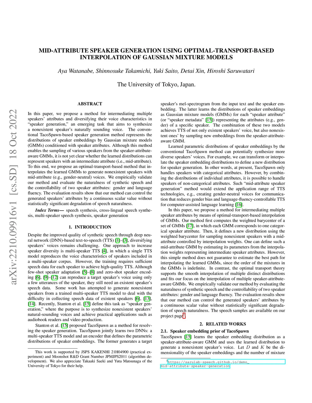 In this paper, we propose a method for intermediating multiple speakers' attributes and diversifying their voice characteristics in ``speaker generation,'' an emerging task that aims to synthesize a nonexistent speaker's naturally sounding voice. The conventional TacoSpawn-based speaker generation method represents the distributions of speaker embeddings by Gaussian mixture models (GMMs) conditioned with speaker attributes. Although this method enables the sampling of various speakers from the speaker-attribute-aware GMMs, it is not yet clear whether the learned distributions can represent speakers with an intermediate attribute (i.e., mid-attribute). To this end, we propose an optimal-transport-based method that interpolates the learned GMMs to generate nonexistent speakers with mid-attribute (e.g., gender-neutral) voices. We empirically validate our method and evaluate the naturalness of synthetic speech and the controllability of two speaker attributes: gender and language fluency. The evaluation results show that our method can control the generated speakers' attributes by a continuous scalar value without statistically significant degradation of speech naturalness.