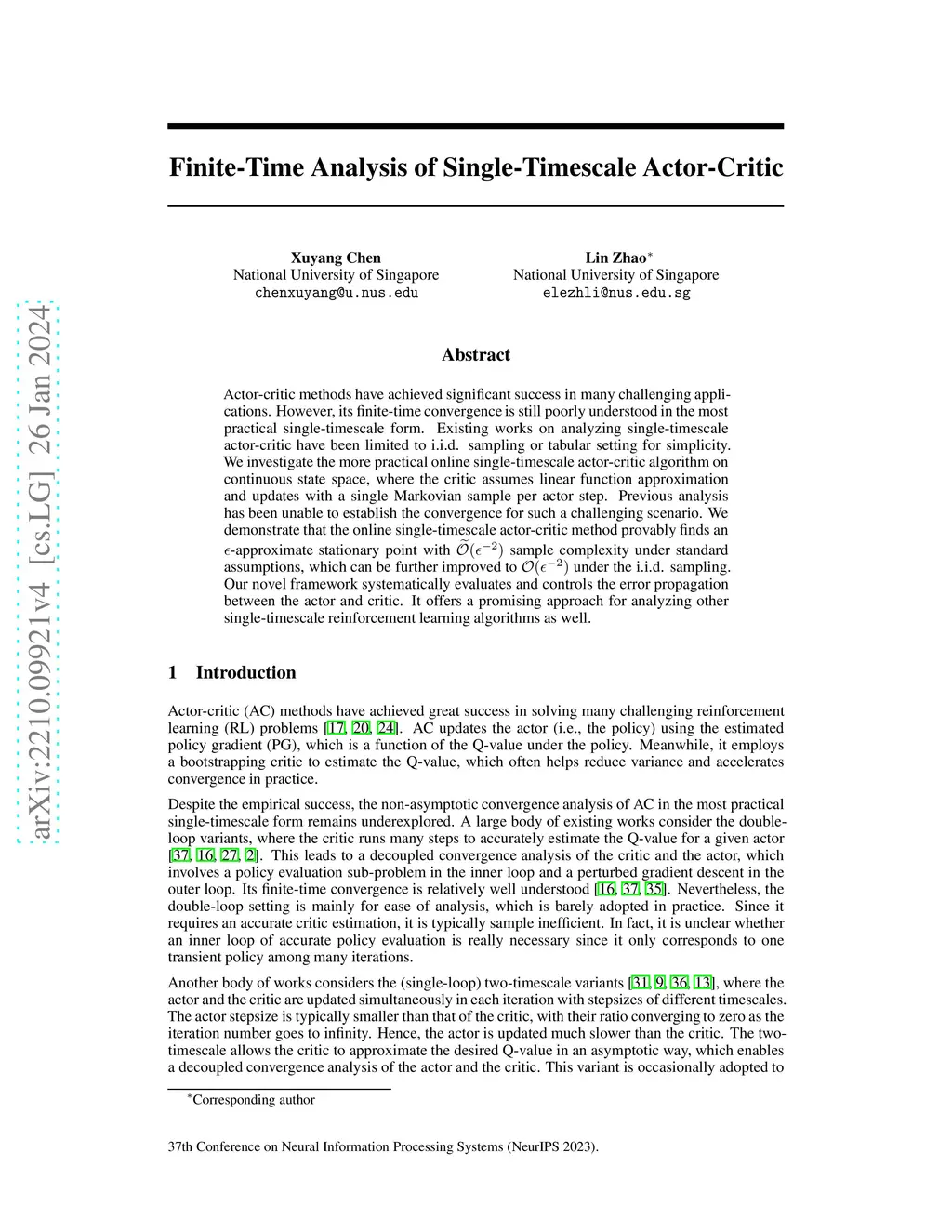 Despite the great empirical success of actor-critic methods, its finite-time convergence is still poorly understood in its most practical form. In particular, the analysis of single-timescale actor-critic presents significant challenges due to the highly inaccurate critic estimation and the complex error propagation dynamics over iterations. Existing works on analyzing single-timescale actor-critic only focus on the i.i.d. sampling or tabular setting for simplicity, which is rarely the case in practical applications. We consider the more practical online single-timescale actor-critic algorithm on continuous state space, where the critic is updated with a single Markovian sample per actor step. We prove that the online single-timescale actor-critic method is guaranteed to find an -approximate stationary point with sample complexity under standard assumptions, which can be further improved to under i.i.d. sampling. Our analysis develops a novel framework that evaluates and controls the error propagation between actor and critic in a systematic way. To our knowledge, this is the first finite-time analysis for online single-timescale actor-critic method. Overall, our results compare favorably to the existing literature on analyzing actor-critic in terms of considering the most practical settings and requiring weaker assumptions.