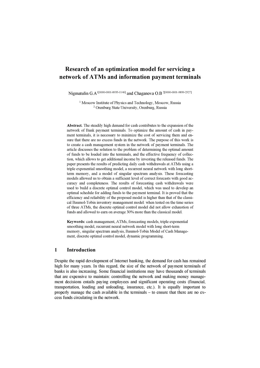 The steadily high demand for cash contributes to the expansion of the network of Bank payment terminals. To optimize the amount of cash in payment terminals, it is necessary to minimize the cost of servicing them and ensure that there are no excess funds in the network. The purpose of this work is to create a cash management system in the network of payment terminals. The article discusses the solution to the problem of determining the optimal amount of funds to be loaded into the terminals, and the effective frequency of collection, which allows to get additional income by investing the released funds. The paper presents the results of predicting daily cash withdrawals at ATMs using a triple exponential smoothing model, a recurrent neural network with long short-term memory, and a model of singular spectrum analysis. These forecasting models allowed us to obtain a sufficient level of correct forecasts with good accuracy and completeness. The results of forecasting cash withdrawals were used to build a discrete optimal control model, which was used to develop an optimal schedule for adding funds to the payment terminal. It is proved that the efficiency and reliability of the proposed model is higher than that of the classical Baumol-Tobin inventory management model: when tested on the time series of three ATMs, the discrete optimal control model did not allow exhaustion of funds and allowed to earn on average 30% more than the classical model.