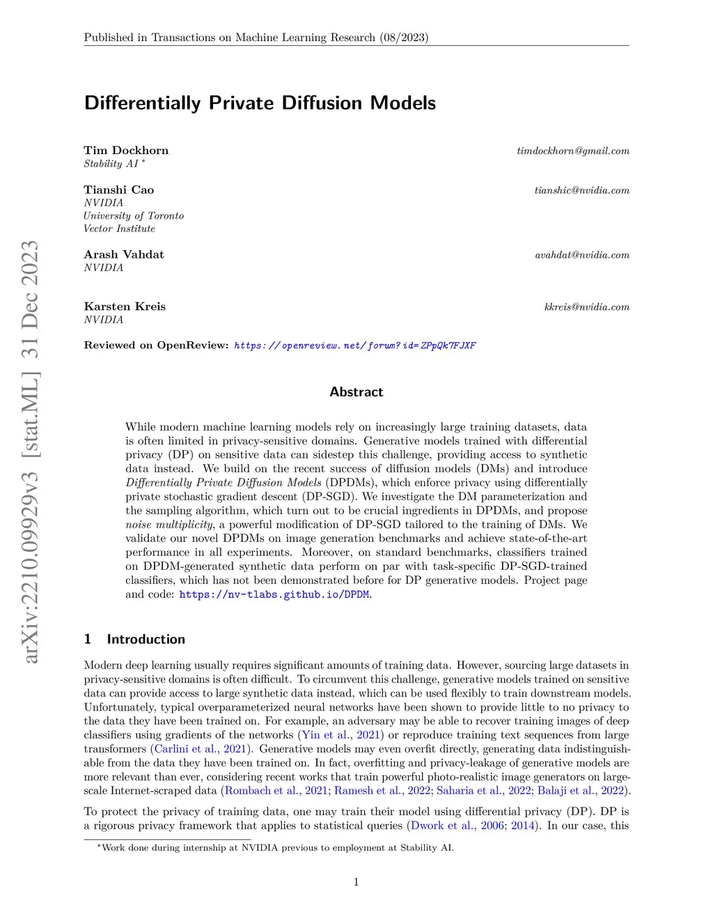 While modern machine learning models rely on increasingly large training datasets, data is often limited in privacy-sensitive domains. Generative models trained with differential privacy (DP) on sensitive data can sidestep this challenge, providing access to synthetic data instead. We build on the recent success of diffusion models (DMs) and introduce Differentially Private Diffusion Models (DPDMs), which enforce privacy using differentially private stochastic gradient descent (DP-SGD). We investigate the DM parameterization and the sampling algorithm, which turn out to be crucial ingredients in DPDMs, and propose noise multiplicity, a powerful modification of DP-SGD tailored to the training of DMs. We validate our novel DPDMs on image generation benchmarks and achieve state-of-the-art performance in all experiments. Moreover, on standard benchmarks, classifiers trained on DPDM-generated synthetic data perform on par with task-specific DP-SGD-trained classifiers, which has not been demonstrated before for DP generative models. Project page and code: https://nv-tlabs.github.io/DPDM.
