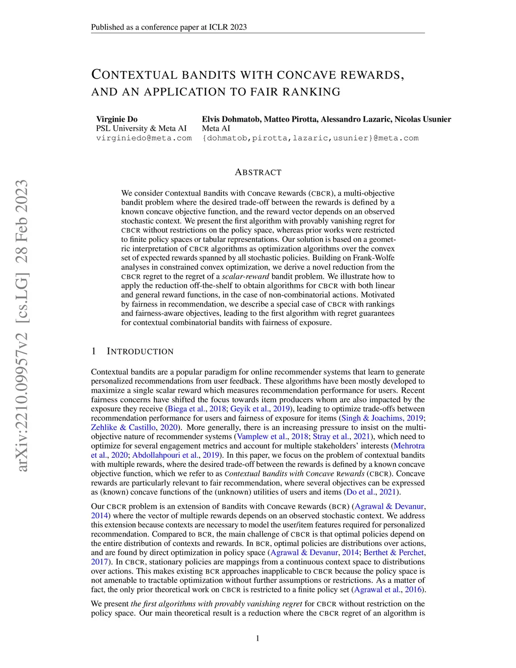We consider Contextual Bandits with Concave Rewards (CBCR), a multi-objective bandit problem where the desired trade-off between the rewards is defined by a known concave objective function, and the reward vector depends on an observed stochastic context. We present the first algorithm with provably vanishing regret for CBCR without restrictions on the policy space, whereas prior works were restricted to finite policy spaces or tabular representations. Our solution is based on a geometric interpretation of CBCR algorithms as optimization algorithms over the convex set of expected rewards spanned by all stochastic policies. Building on Frank-Wolfe analyses in constrained convex optimization, we derive a novel reduction from the CBCR regret to the regret of a scalar-reward bandit problem. We illustrate how to apply the reduction off-the-shelf to obtain algorithms for CBCR with both linear and general reward functions, in the case of non-combinatorial actions. Motivated by fairness in recommendation, we describe a special case of CBCR with rankings and fairness-aware objectives, leading to the first algorithm with regret guarantees for contextual combinatorial bandits with fairness of exposure.