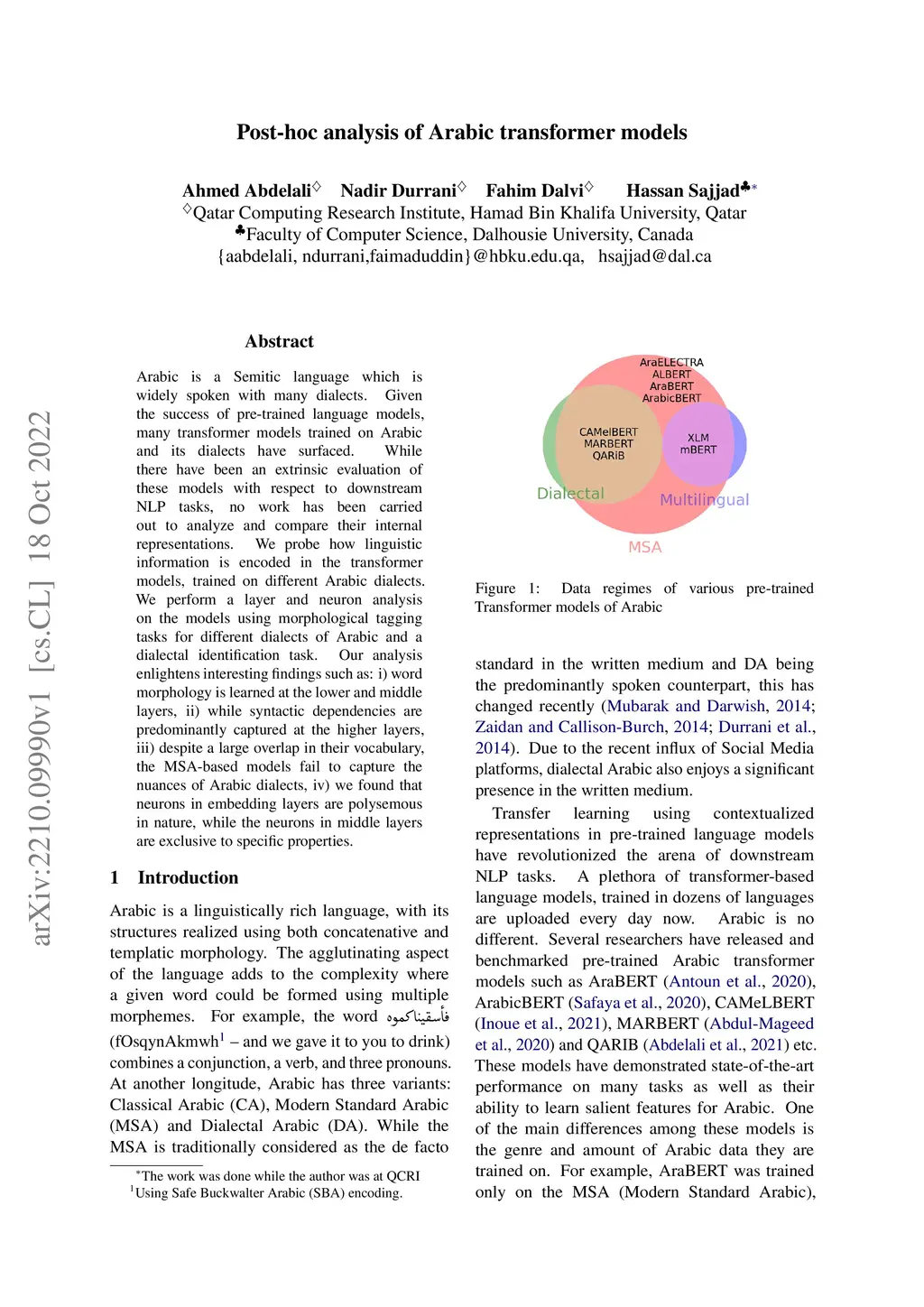 Arabic is a Semitic language which is widely spoken with many dialects. Given the success of pre-trained language models, many transformer models trained on Arabic and its dialects have surfaced. While there have been an extrinsic evaluation of these models with respect to downstream NLP tasks, no work has been carried out to analyze and compare their internal representations. We probe how linguistic information is encoded in the transformer models, trained on different Arabic dialects. We perform a layer and neuron analysis on the models using morphological tagging tasks for different dialects of Arabic and a dialectal identification task. Our analysis enlightens interesting findings such as: i) word morphology is learned at the lower and middle layers, ii) while syntactic dependencies are predominantly captured at the higher layers, iii) despite a large overlap in their vocabulary, the MSA-based models fail to capture the nuances of Arabic dialects, iv) we found that neurons in embedding layers are polysemous in nature, while the neurons in middle layers are exclusive to specific properties