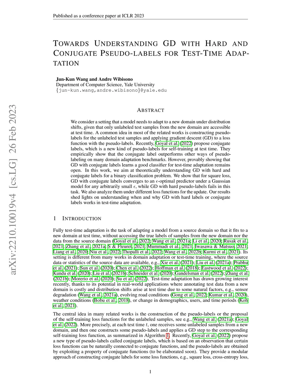 We consider a setting that a model needs to adapt to a new domain under distribution shifts, given that only unlabeled test samples from the new domain are accessible at test time. A common idea in most of the related works is constructing pseudo-labels for the unlabeled test samples and applying gradient descent (GD) to a loss function with the pseudo-labels. Recently, \cite{GSRK22} propose conjugate labels, which is a new kind of pseudo-labels for self-training at test time. They empirically show that the conjugate label outperforms other ways of pseudo-labeling on many domain adaptation benchmarks. However, provably showing that GD with conjugate labels learns a good classifier for test-time adaptation remains open. In this work, we aim at theoretically understanding GD with hard and conjugate labels for a binary classification problem. We show that for square loss, GD with conjugate labels converges to an -optimal predictor under a Gaussian model for any arbitrarily small , while GD with hard pseudo-labels fails in this task. We also analyze them under different loss functions for the update. Our results shed lights on understanding when and why GD with hard labels or conjugate labels works in test-time adaptation.