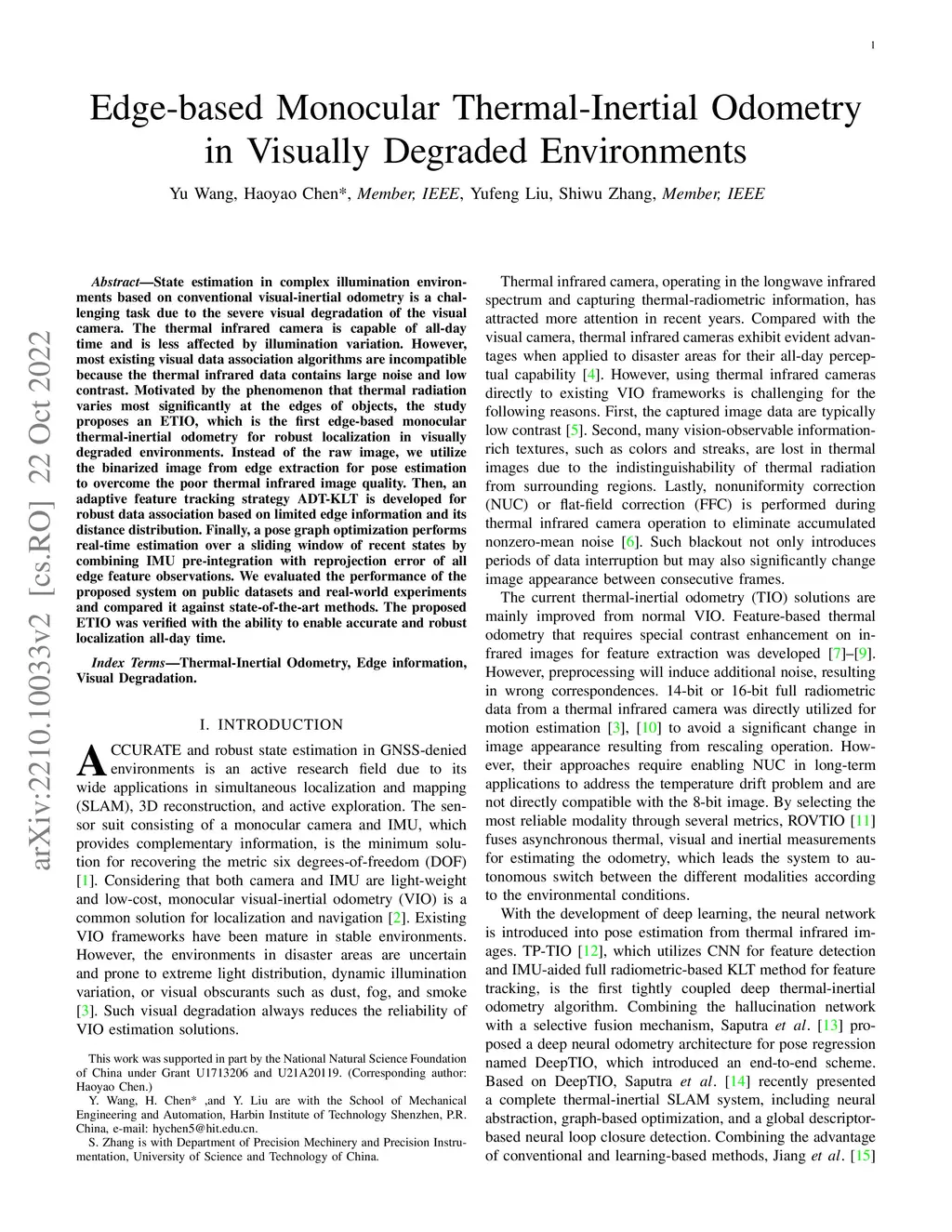 State estimation in complex illumination environments based on conventional visual-inertial odometry is a challenging task due to the severe visual degradation of the visual camera. The thermal infrared camera is capable of all-day time and is less affected by illumination variation. However, most existing visual data association algorithms are incompatible because the thermal infrared data contains large noise and low contrast. Motivated by the phenomenon that thermal radiation varies most significantly at the edges of objects, the study proposes an ETIO, which is the first edge-based monocular thermal-inertial odometry for robust localization in visually degraded environments. Instead of the raw image, we utilize the binarized image from edge extraction for pose estimation to overcome the poor thermal infrared image quality. Then, an adaptive feature tracking strategy ADT-KLT is developed for robust data association based on limited edge information and its distance distribution. Finally, a pose graph optimization performs real-time estimation over a sliding window of recent states by combining IMU pre-integration with reprojection error of all edge feature observations. We evaluated the performance of the proposed system on public datasets and real-world experiments and compared it against state-of-the-art methods. The proposed ETIO was verified with the ability to enable accurate and robust localization all-day time.
