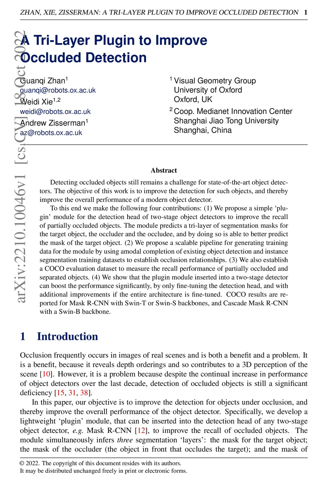 Detecting occluded objects still remains a challenge for state-of-the-art object detectors. The objective of this work is to improve the detection for such objects, and thereby improve the overall performance of a modern object detector. To this end we make the following four contributions: (1) We propose a simple 'plugin' module for the detection head of two-stage object detectors to improve the recall of partially occluded objects. The module predicts a tri-layer of segmentation masks for the target object, the occluder and the occludee, and by doing so is able to better predict the mask of the target object. (2) We propose a scalable pipeline for generating training data for the module by using amodal completion of existing object detection and instance segmentation training datasets to establish occlusion relationships. (3) We also establish a COCO evaluation dataset to measure the recall performance of partially occluded and separated objects. (4) We show that the plugin module inserted into a two-stage detector can boost the performance significantly, by only fine-tuning the detection head, and with additional improvements if the entire architecture is fine-tuned. COCO results are reported for Mask R-CNN with Swin-T or Swin-S backbones, and Cascade Mask R-CNN with a Swin-B backbone.