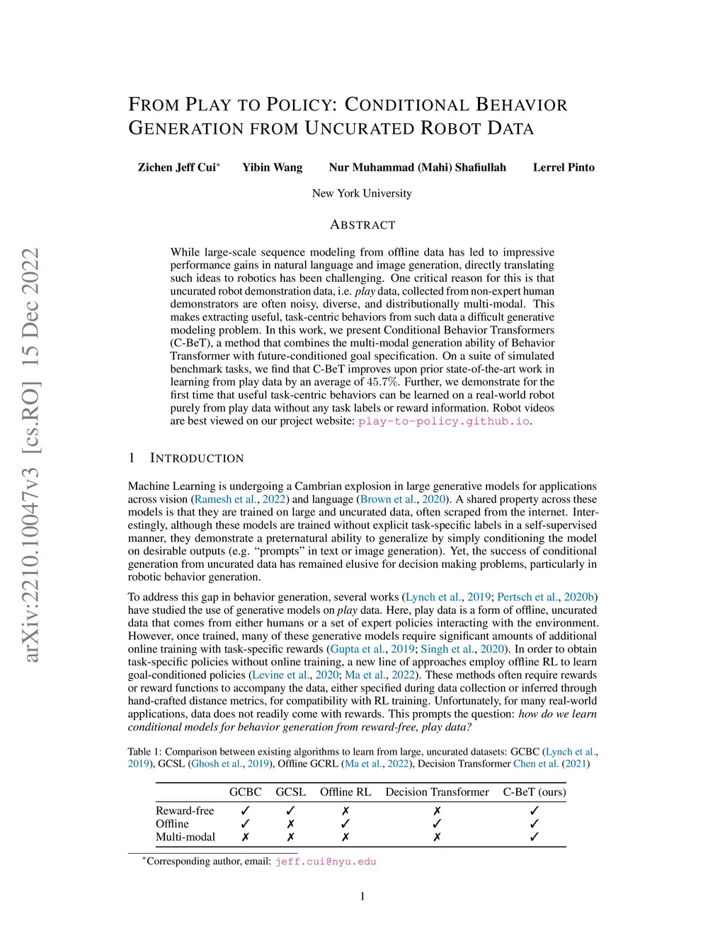 While large-scale sequence modeling from offline data has led to impressive performance gains in natural language and image generation, directly translating such ideas to robotics has been challenging. One critical reason for this is that uncurated robot demonstration data, i.e. play data, collected from non-expert human demonstrators are often noisy, diverse, and distributionally multi-modal. This makes extracting useful, task-centric behaviors from such data a difficult generative modeling problem. In this work, we present Conditional Behavior Transformers (C-BeT), a method that combines the multi-modal generation ability of Behavior Transformer with future-conditioned goal specification. On a suite of simulated benchmark tasks, we find that C-BeT improves upon prior state-of-the-art work in learning from play data by an average of 45.7%. Further, we demonstrate for the first time that useful task-centric behaviors can be learned on a real-world robot purely from play data without any task labels or reward information. Robot videos are best viewed on our project website: https://play-to-policy.github.io
