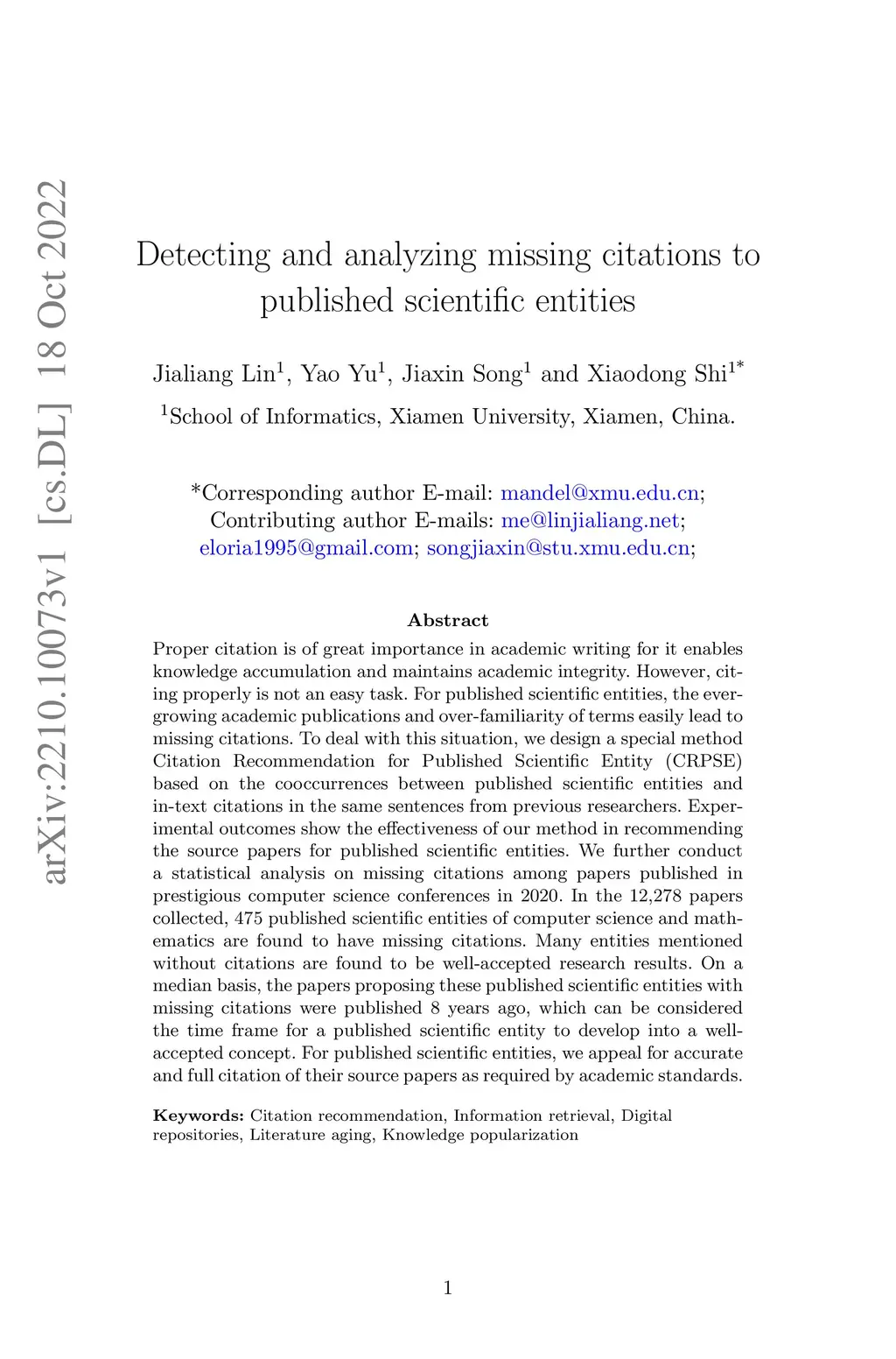 Proper citation is of great importance in academic writing for it enables knowledge accumulation and maintains academic integrity. However, citing properly is not an easy task. For published scientific entities, the ever-growing academic publications and over-familiarity of terms easily lead to missing citations. To deal with this situation, we design a special method Citation Recommendation for Published Scientific Entity (CRPSE) based on the cooccurrences between published scientific entities and in-text citations in the same sentences from previous researchers. Experimental outcomes show the effectiveness of our method in recommending the source papers for published scientific entities. We further conduct a statistical analysis on missing citations among papers published in prestigious computer science conferences in 2020. In the 12,278 papers collected, 475 published scientific entities of computer science and mathematics are found to have missing citations. Many entities mentioned without citations are found to be well-accepted research results. On a median basis, the papers proposing these published scientific entities with missing citations were published 8 years ago, which can be considered the time frame for a published scientific entity to develop into a well-accepted concept. For published scientific entities, we appeal for accurate and full citation of their source papers as required by academic standards.