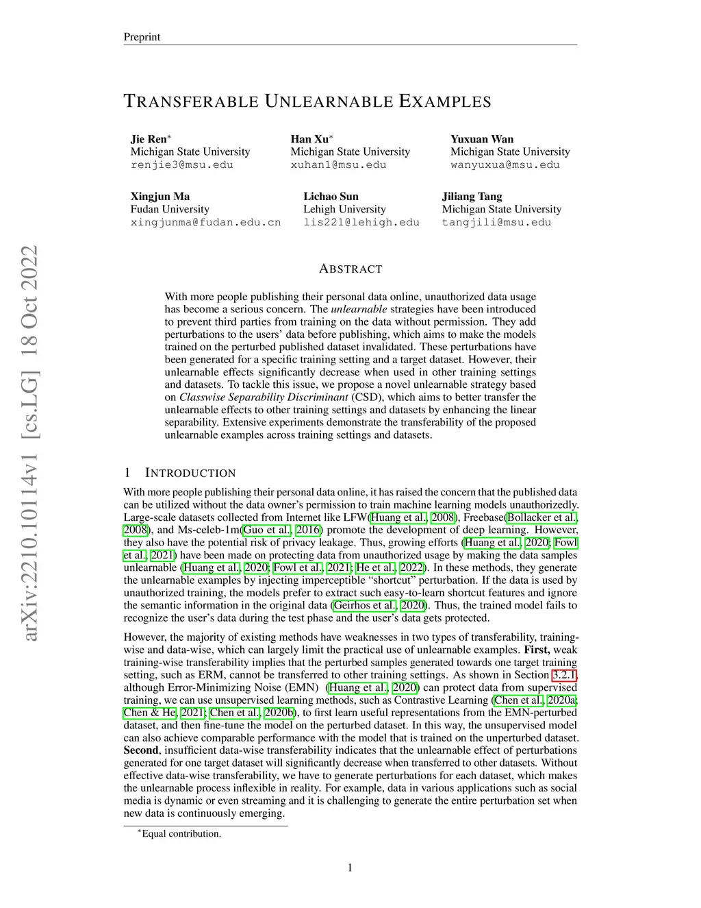 Transferable Unlearnable Examples
