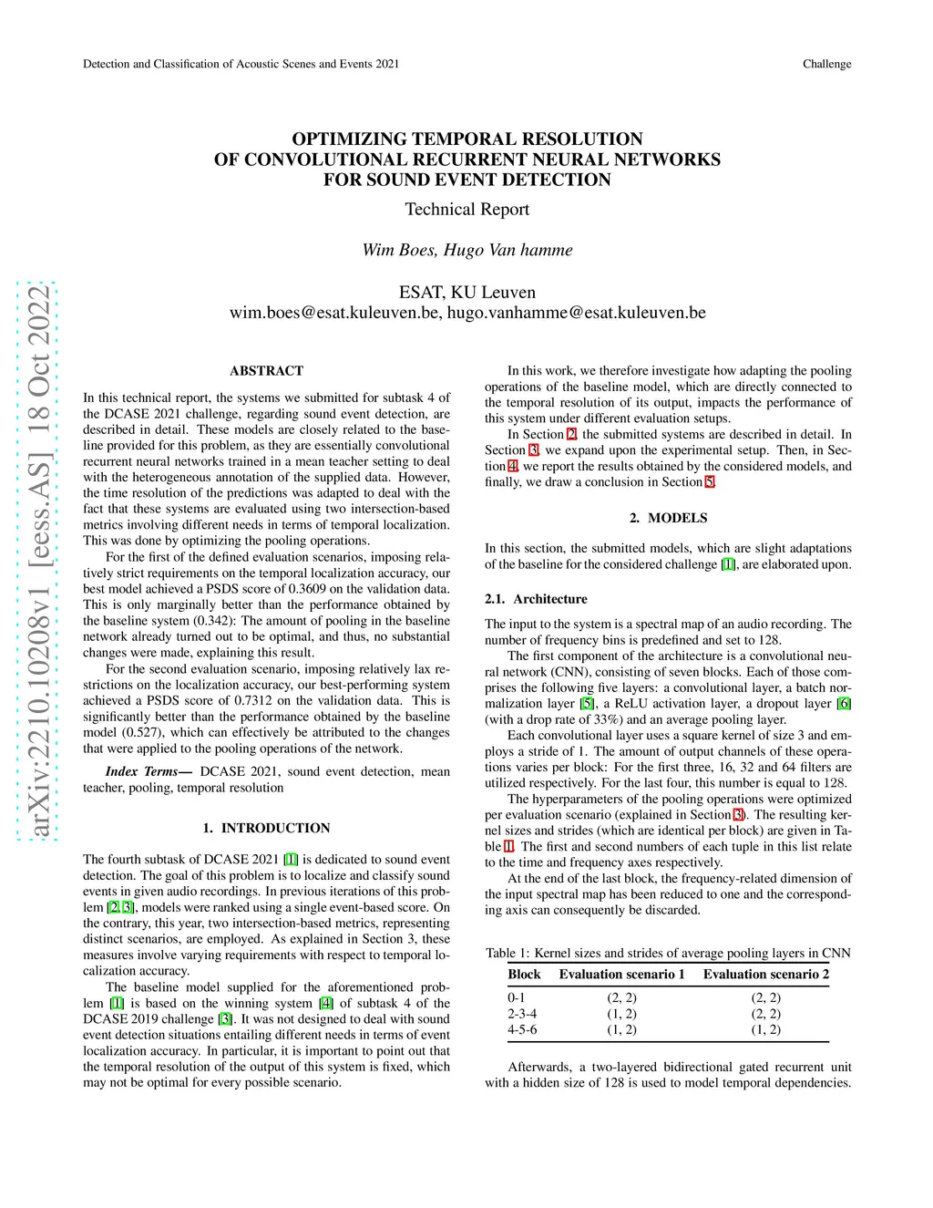 In this technical report, the systems we submitted for subtask 4 of the DCASE 2021 challenge, regarding sound event detection, are described in detail. These models are closely related to the baseline provided for this problem, as they are essentially convolutional recurrent neural networks trained in a mean teacher setting to deal with the heterogeneous annotation of the supplied data. However, the time resolution of the predictions was adapted to deal with the fact that these systems are evaluated using two intersection-based metrics involving different needs in terms of temporal localization. This was done by optimizing the pooling operations. For the first of the defined evaluation scenarios, imposing relatively strict requirements on the temporal localization accuracy, our best model achieved a PSDS score of 0.3609 on the validation data. This is only marginally better than the performance obtained by the baseline system (0.342): The amount of pooling in the baseline network already turned out to be optimal, and thus, no substantial changes were made, explaining this result. For the second evaluation scenario, imposing relatively lax restrictions on the localization accuracy, our best-performing system achieved a PSDS score of 0.7312 on the validation data. This is significantly better than the performance obtained by the baseline model (0.527), which can effectively be attributed to the changes that were applied to the pooling operations of the network.