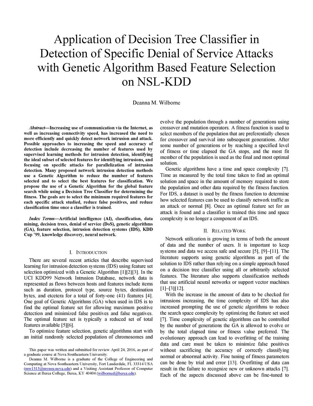 Using a Genetic Algorithm and Decision Tree Classifier, the features of the NSL-KDD dataset are reduced using combinatorial optimization to determine the minimum features required to accurately classify Denial of Service attacks within the NSL-KDD dataset.