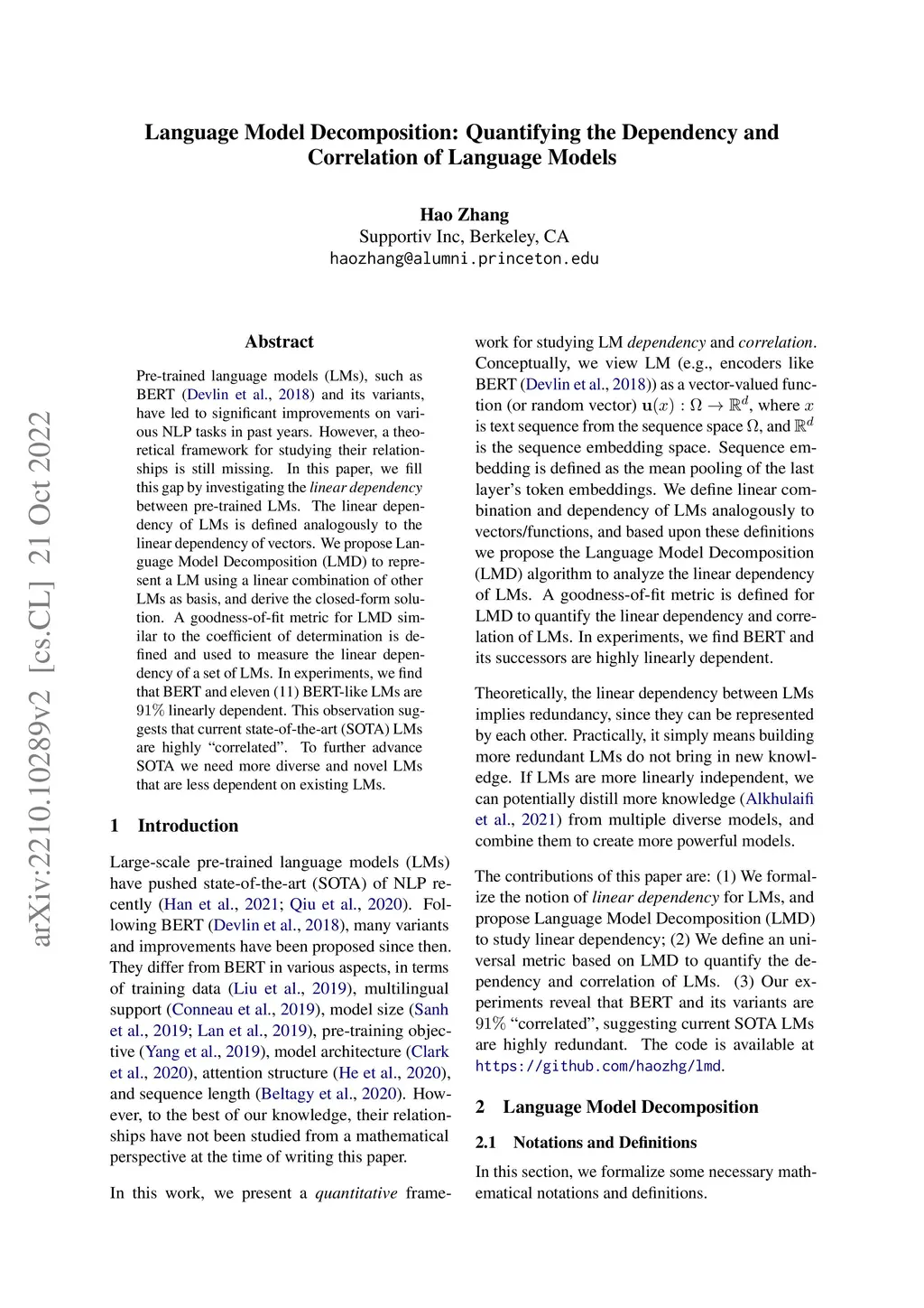Pre-trained language models (LMs), such as BERT (Devlin et al., 2018) and its variants, have led to significant improvements on various NLP tasks in past years. However, a theoretical framework for studying their relationships is still missing. In this paper, we fill this gap by investigating the linear dependency between pre-trained LMs. The linear dependency of LMs is defined analogously to the linear dependency of vectors. We propose Language Model Decomposition (LMD) to represent a LM using a linear combination of other LMs as basis, and derive the closed-form solution. A goodness-of-fit metric for LMD similar to the coefficient of determination is defined and used to measure the linear dependency of a set of LMs. In experiments, we find that BERT and eleven (11) BERT-like LMs are 91% linearly dependent. This observation suggests that current state-of-the-art (SOTA) LMs are highly "correlated". To further advance SOTA we need more diverse and novel LMs that are less dependent on existing LMs.