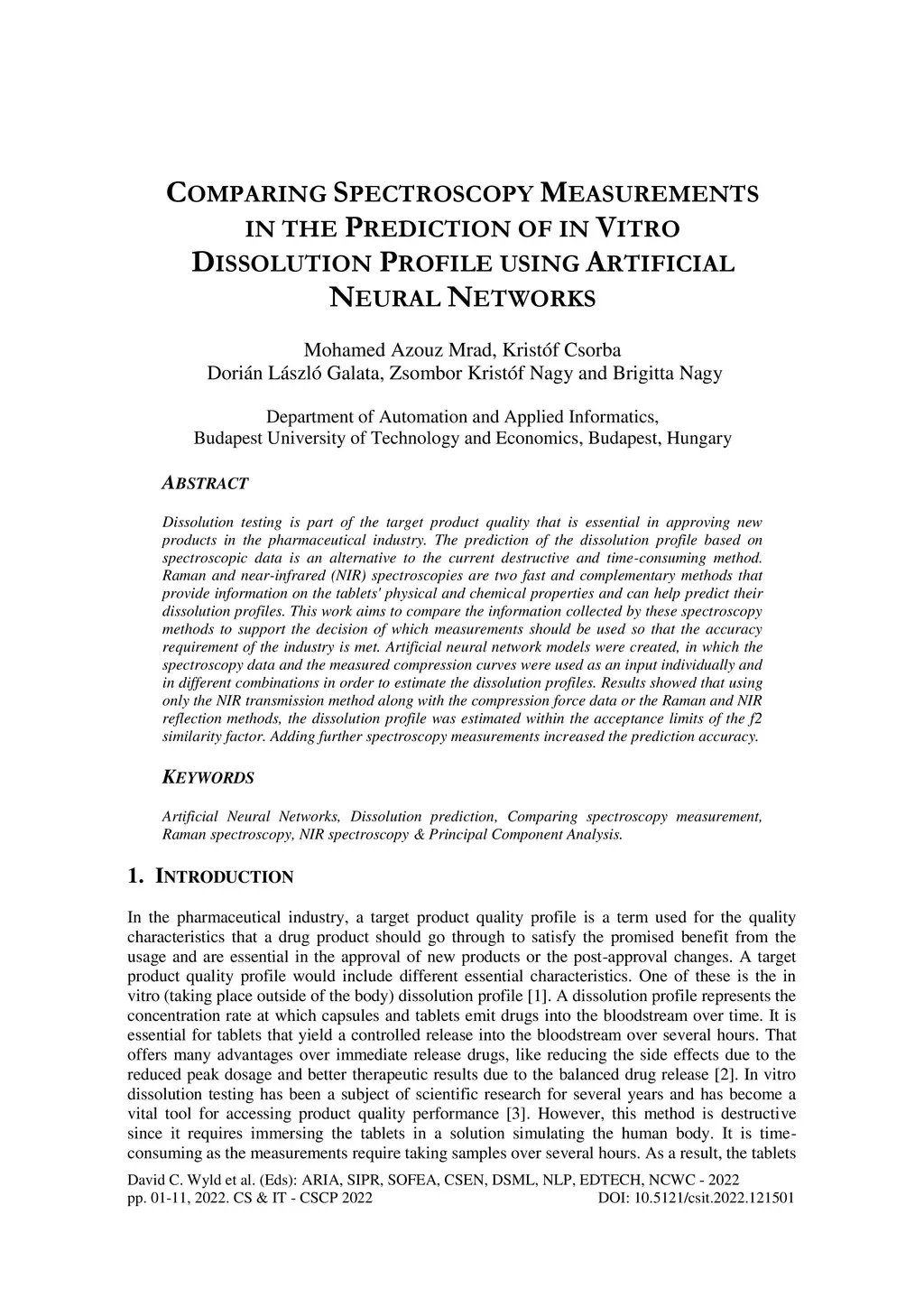Dissolution testing is part of the target product quality that is essential in approving new products in the pharmaceutical industry. The prediction of the dissolution profile based on spectroscopic data is an alternative to the current destructive and time-consuming method. Raman and near-infrared (NIR) spectroscopies are two fast and complementary methods that provide information on the tablets' physical and chemical properties and can help predict their dissolution profiles. This work aims to compare the information collected by these spectroscopy methods to support the decision of which measurements should be used so that the accuracy requirement of the industry is met. Artificial neural network models were created, in which the spectroscopy data and the measured compression curves were used as an input individually and in different combinations in order to estimate the dissolution profiles. Results showed that using only the NIR transmission method along with the compression force data or the Raman and NIR reflection methods, the dissolution profile was estimated within the acceptance limits of the f2 similarity factor. Adding further spectroscopy measurements increased the prediction accuracy.