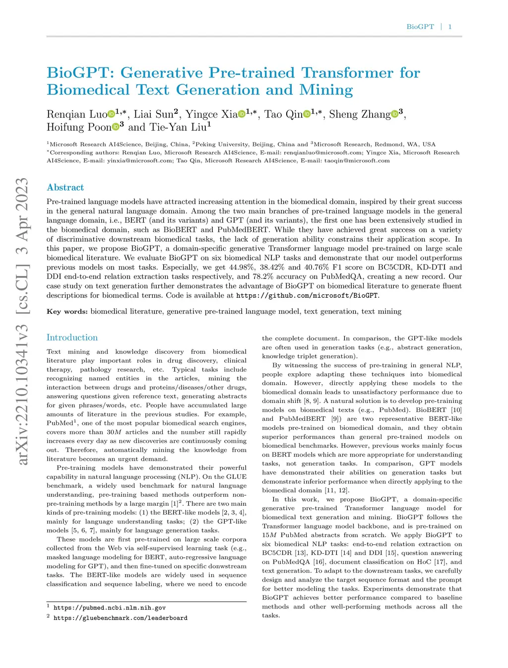 BioGPT: Generative Pre-trained Transformer for Biomedical Text