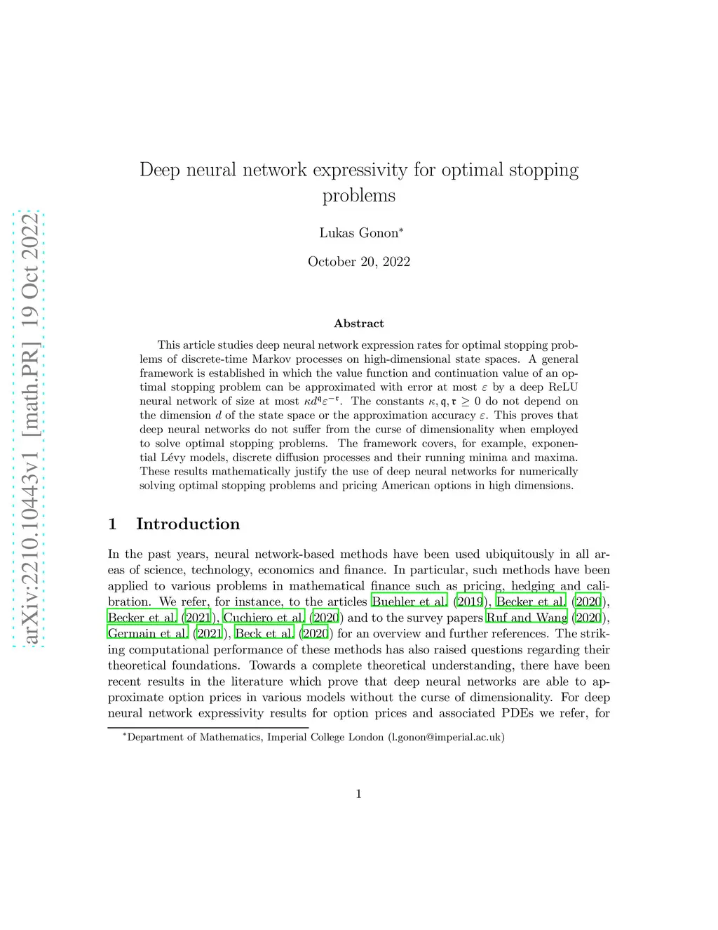 This article studies deep neural network expression rates for optimal stopping problems of discrete-time Markov processes on high-dimensional state spaces. A general framework is established in which the value function and continuation value of an optimal stopping problem can be approximated with error at most by a deep ReLU neural network of size at most . The constants do not depend on the dimension of the state space or the approximation accuracy . This proves that deep neural networks do not suffer from the curse of dimensionality when employed to solve optimal stopping problems. The framework covers, for example, exponential L\évy models, discrete diffusion processes and their running minima and maxima. These results mathematically justify the use of deep neural networks for numerically solving optimal stopping problems and pricing American options in high dimensions.