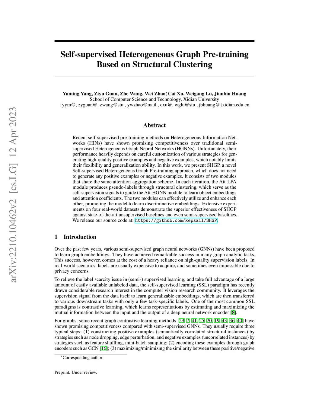 Recent self-supervised pre-training methods on Heterogeneous Information Networks (HINs) have shown promising competitiveness over traditional semi-supervised Heterogeneous Graph Neural Networks (HGNNs). Unfortunately, their performance heavily depends on careful customization of various strategies for generating high-quality positive examples and negative examples, which notably limits their flexibility and generalization ability. In this work, we present SHGP, a novel Self-supervised Heterogeneous Graph Pre-training approach, which does not need to generate any positive examples or negative examples. It consists of two modules that share the same attention-aggregation scheme. In each iteration, the Att-LPA module produces pseudo-labels through structural clustering, which serve as the self-supervision signals to guide the Att-HGNN module to learn object embeddings and attention coefficients. The two modules can effectively utilize and enhance each other, promoting the model to learn discriminative embeddings. Extensive experiments on four real-world datasets demonstrate the superior effectiveness of SHGP against state-of-the-art unsupervised baselines and even semi-supervised baselines. We release our source code at: https://github.com/kepsail/SHGP.