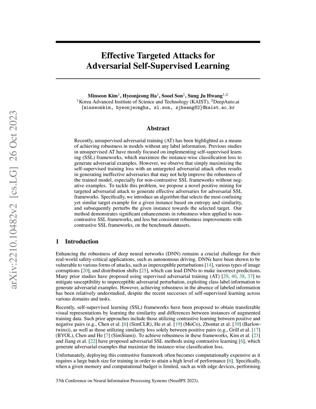 Recently, unsupervised adversarial training (AT) has been highlighted as a means of achieving robustness in models without any label information. Previous studies in unsupervised AT have mostly focused on implementing self-supervised learning (SSL) frameworks, which maximize the instance-wise classification loss to generate adversarial examples. However, we observe that simply maximizing the self-supervised training loss with an untargeted adversarial attack often results in generating ineffective adversaries that may not help improve the robustness of the trained model, especially for non-contrastive SSL frameworks without negative examples. To tackle this problem, we propose a novel positive mining for targeted adversarial attack to generate effective adversaries for adversarial SSL frameworks. Specifically, we introduce an algorithm that selects the most confusing yet similar target example for a given instance based on entropy and similarity, and subsequently perturbs the given instance towards the selected target. Our method demonstrates significant enhancements in robustness when applied to non-contrastive SSL frameworks, and less but consistent robustness improvements with contrastive SSL frameworks, on the benchmark datasets.