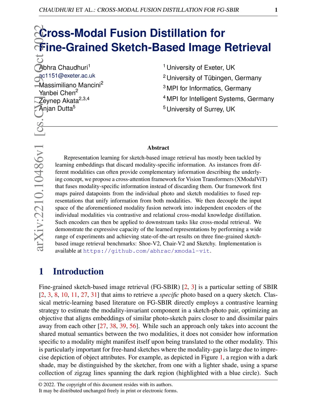 Representation learning for sketch-based image retrieval has mostly been tackled by learning embeddings that discard modality-specific information. As instances from different modalities can often provide complementary information describing the underlying concept, we propose a cross-attention framework for Vision Transformers (XModalViT) that fuses modality-specific information instead of discarding them. Our framework first maps paired datapoints from the individual photo and sketch modalities to fused representations that unify information from both modalities. We then decouple the input space of the aforementioned modality fusion network into independent encoders of the individual modalities via contrastive and relational cross-modal knowledge distillation. Such encoders can then be applied to downstream tasks like cross-modal retrieval. We demonstrate the expressive capacity of the learned representations by performing a wide range of experiments and achieving state-of-the-art results on three fine-grained sketch-based image retrieval benchmarks: Shoe-V2, Chair-V2 and Sketchy. Implementation is available at https://github.com/abhrac/xmodal-vit.