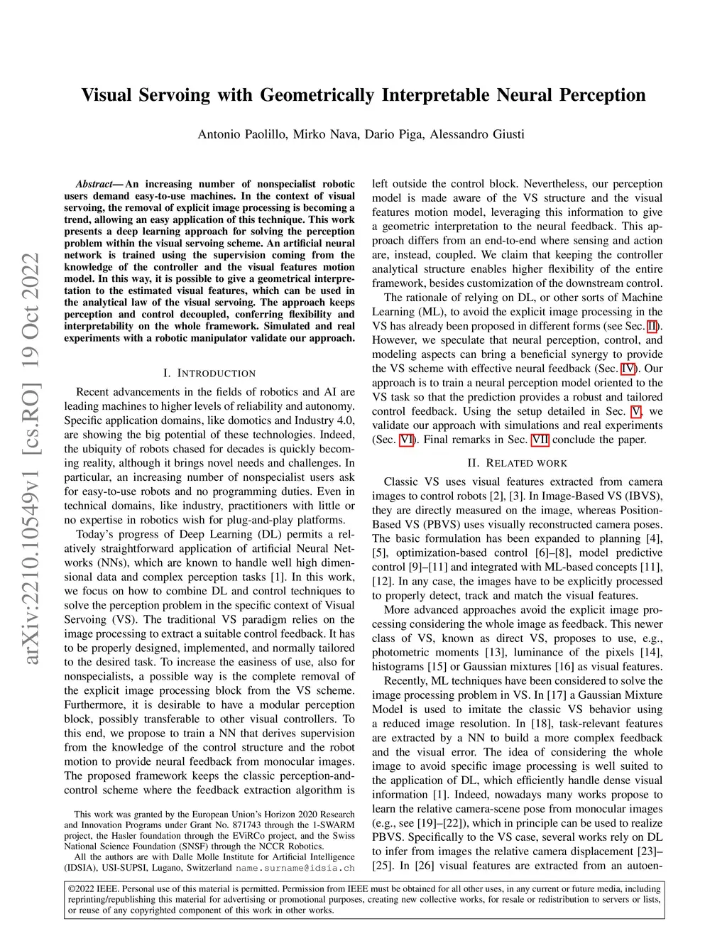 Visual Servoing with Geometrically Interpretable Neural Perception