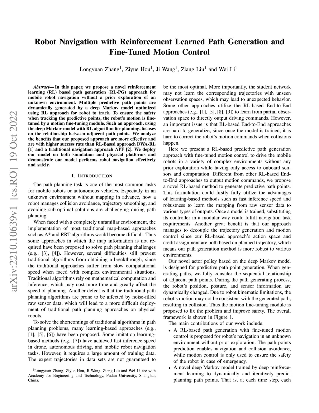 In this paper, we propose a novel reinforcement learning (RL) based path generation (RL-PG) approach for mobile robot navigation without a prior exploration of an unknown environment. Multiple predictive path points are dynamically generated by a deep Markov model optimized using RL approach for robot to track. To ensure the safety when tracking the predictive points, the robot's motion is fine-tuned by a motion fine-tuning module. Such an approach, using the deep Markov model with RL algorithm for planning, focuses on the relationship between adjacent path points. We analyze the benefits that our proposed approach are more effective and are with higher success rate than RL-Based approach DWA-RL and a traditional navigation approach APF. We deploy our model on both simulation and physical platforms and demonstrate our model performs robot navigation effectively and safely.