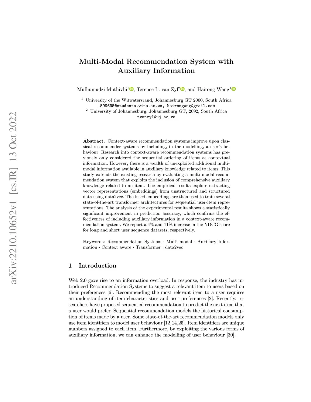 Context-aware recommendation systems improve upon classical recommender systems by including, in the modelling, a user's behaviour. Research into context-aware recommendation systems has previously only considered the sequential ordering of items as contextual information. However, there is a wealth of unexploited additional multi-modal information available in auxiliary knowledge related to items. This study extends the existing research by evaluating a multi-modal recommendation system that exploits the inclusion of comprehensive auxiliary knowledge related to an item. The empirical results explore extracting vector representations (embeddings) from unstructured and structured data using data2vec. The fused embeddings are then used to train several state-of-the-art transformer architectures for sequential user-item representations. The analysis of the experimental results shows a statistically significant improvement in prediction accuracy, which confirms the effectiveness of including auxiliary information in a context-aware recommendation system. We report a 4% and 11% increase in the NDCG score for long and short user sequence datasets, respectively.