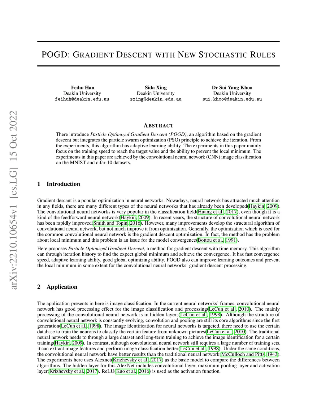 There introduce Particle Optimized Gradient Descent (POGD), an algorithm based on the gradient descent but integrates the particle swarm optimization (PSO) principle to achieve the iteration. From the experiments, this algorithm has adaptive learning ability. The experiments in this paper mainly focus on the training speed to reach the target value and the ability to prevent the local minimum. The experiments in this paper are achieved by the convolutional neural network (CNN) image classification on the MNIST and cifar-10 datasets.