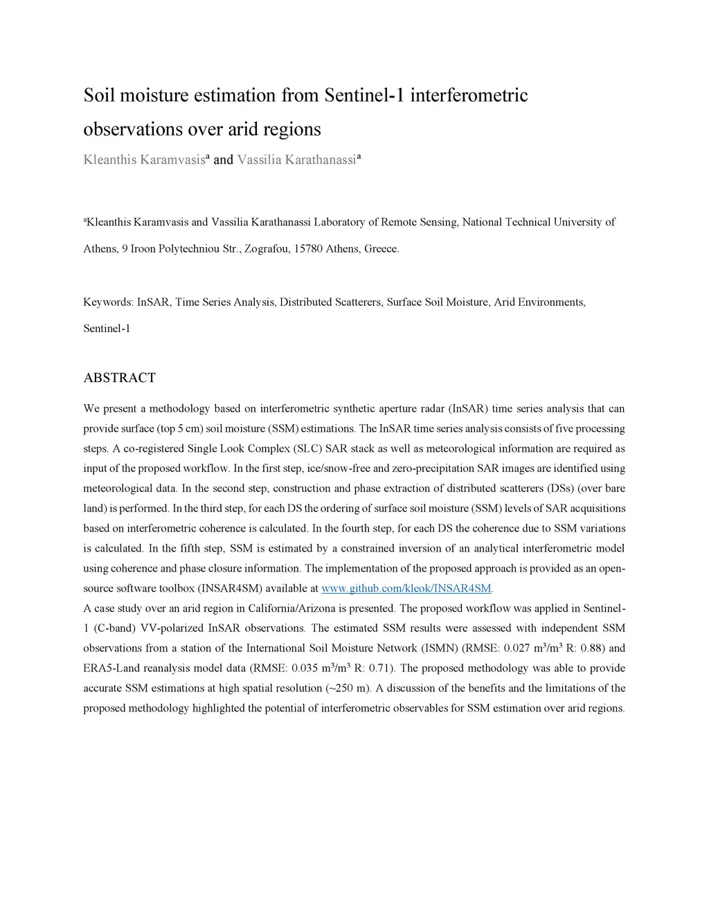 We present a methodology based on interferometric synthetic aperture radar (InSAR) time series analysis that can provide surface (top 5 cm) soil moisture (SSM) estimations. The InSAR time series analysis consists of five processing steps. A co-registered Single Look Complex (SLC) SAR stack as well as meteorological information are required as input of the proposed workflow. In the first step, ice/snow-free and zero-precipitation SAR images are identified using meteorological data. In the second step, construction and phase extraction of distributed scatterers (DSs) (over bare land) is performed. In the third step, for each DS the ordering of surface soil moisture (SSM) levels of SAR acquisitions based on interferometric coherence is calculated. In the fourth step, for each DS the coherence due to SSM variations is calculated. In the fifth step, SSM is estimated by a constrained inversion of an analytical interferometric model using coherence and phase closure information. The implementation of the proposed approach is provided as an open-source software toolbox (INSAR4SM) available at www.github.com/kleok/INSAR4SM. A case study over an arid region in California/Arizona is presented. The proposed workflow was applied in Sentinel- 1 (C-band) VV-polarized InSAR observations. The estimated SSM results were assessed with independent SSM observations from a station of the International Soil Moisture Network (ISMN) (RMSE: 0.027 R: 0.88) and ERA5-Land reanalysis model data (RMSE: 0.035 R: 0.71). The proposed methodology was able to provide accurate SSM estimations at high spatial resolution (~250 m). A discussion of the benefits and the limitations of the proposed methodology highlighted the potential of interferometric observables for SSM estimation over arid regions.