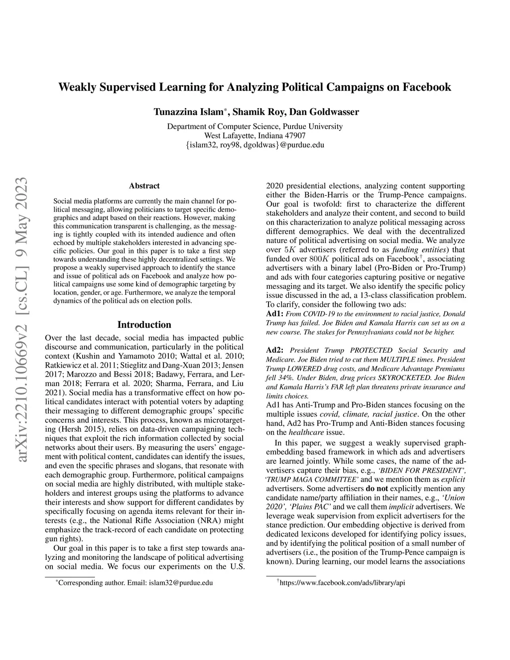 Weakly Supervised Learning for Analyzing Political Campaigns on Facebook